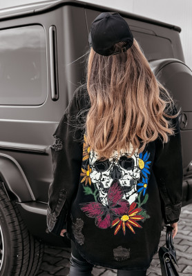 Dlhá riflovka s odreninami a potlačou Flowers Skull čierna