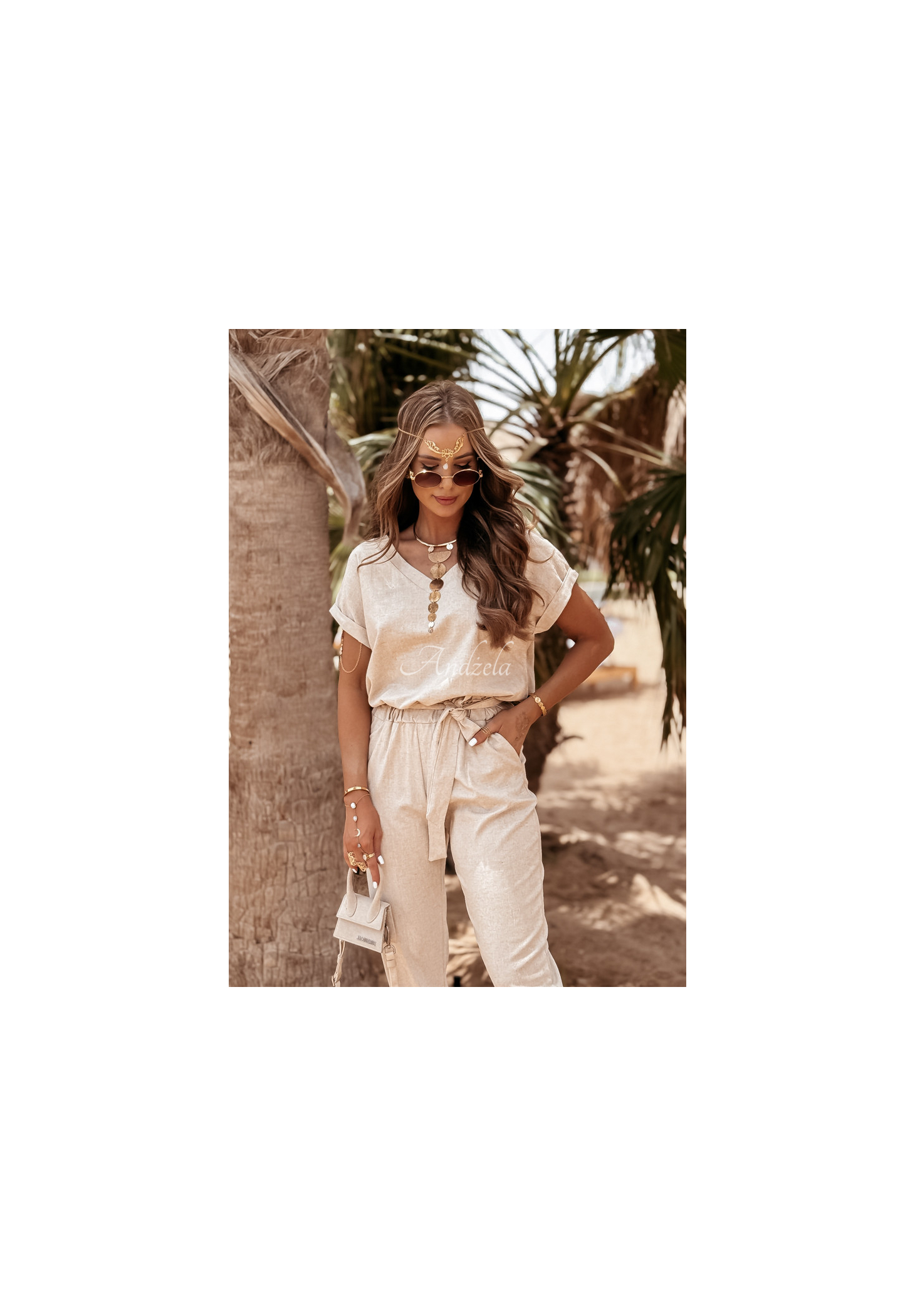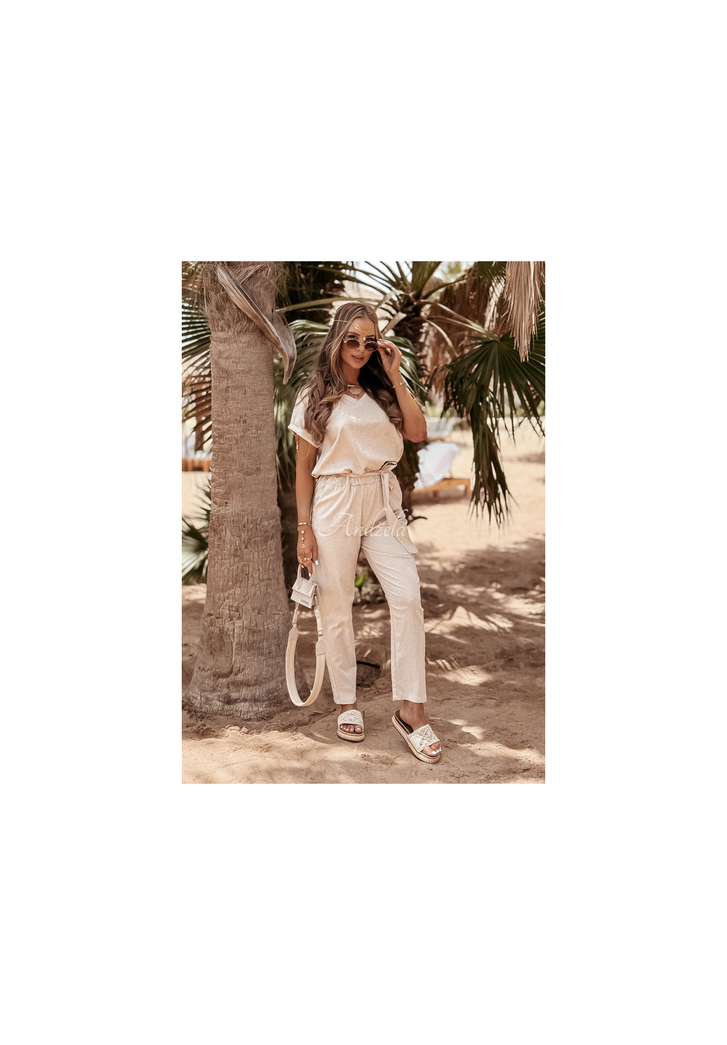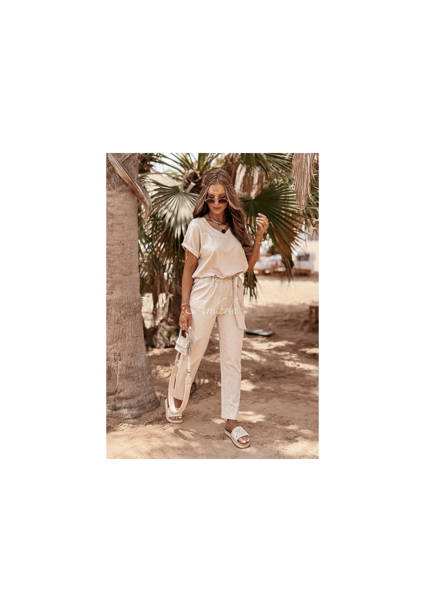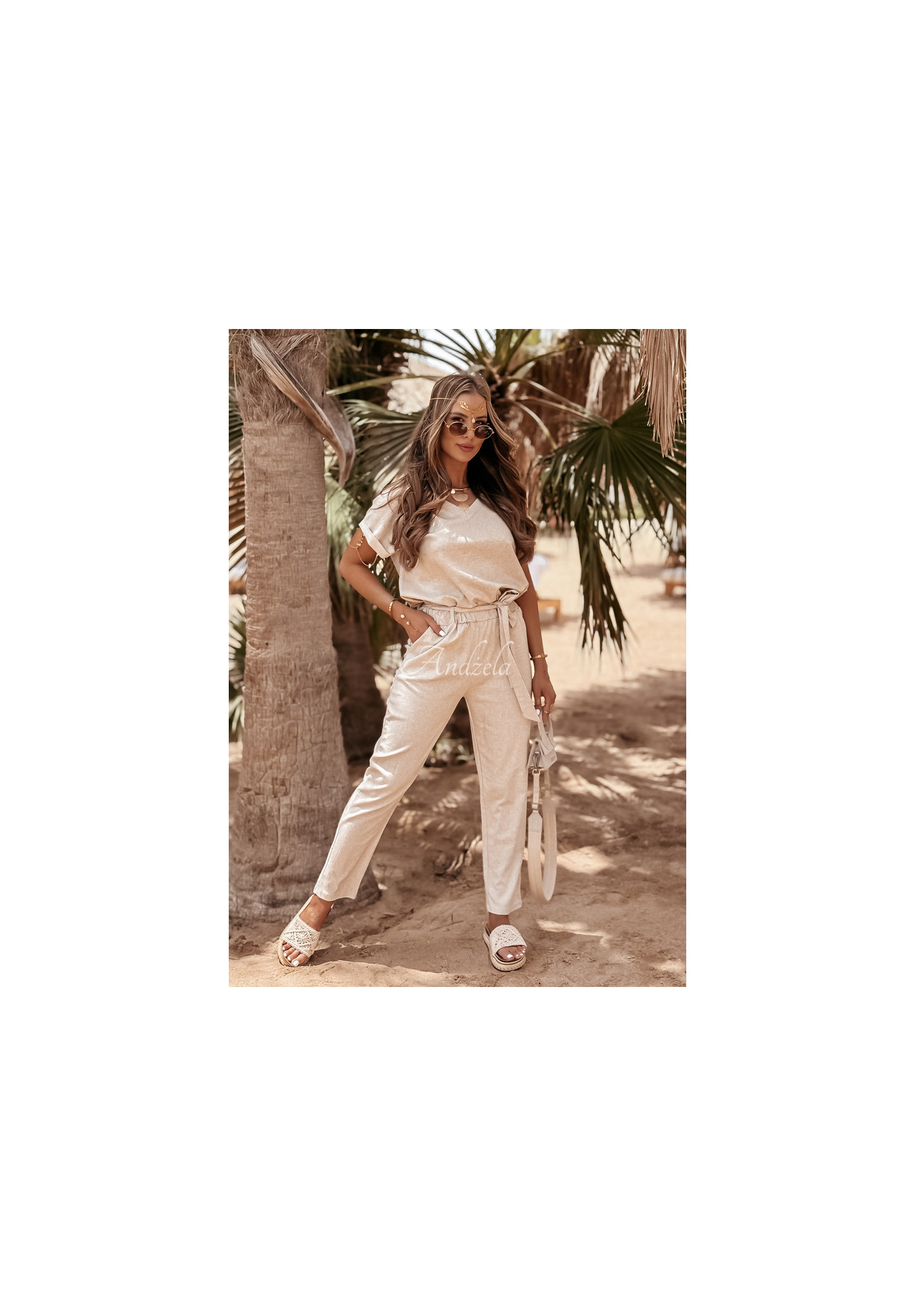Súprava z kvalitného materiálu kombinujúceho ľan a viskózu nesmie chýbať v žiadnom letnom šatníku. Tričko klasického strihu má ženský výstrih do V a trvalo vyhrnuté rukávy. Nohavice so zúženými nohavicami sú modelom s funkčnými vreckami a gumou v páse, vďaka čomu dokonale padnú na postavu. Súčasťou je aj opasok, ktorý skvele doplní akýkoľvek look. Táto súprava je možnosťou, ktorá vám umožní vytvoriť veľa štýlov pre horúce dni.
