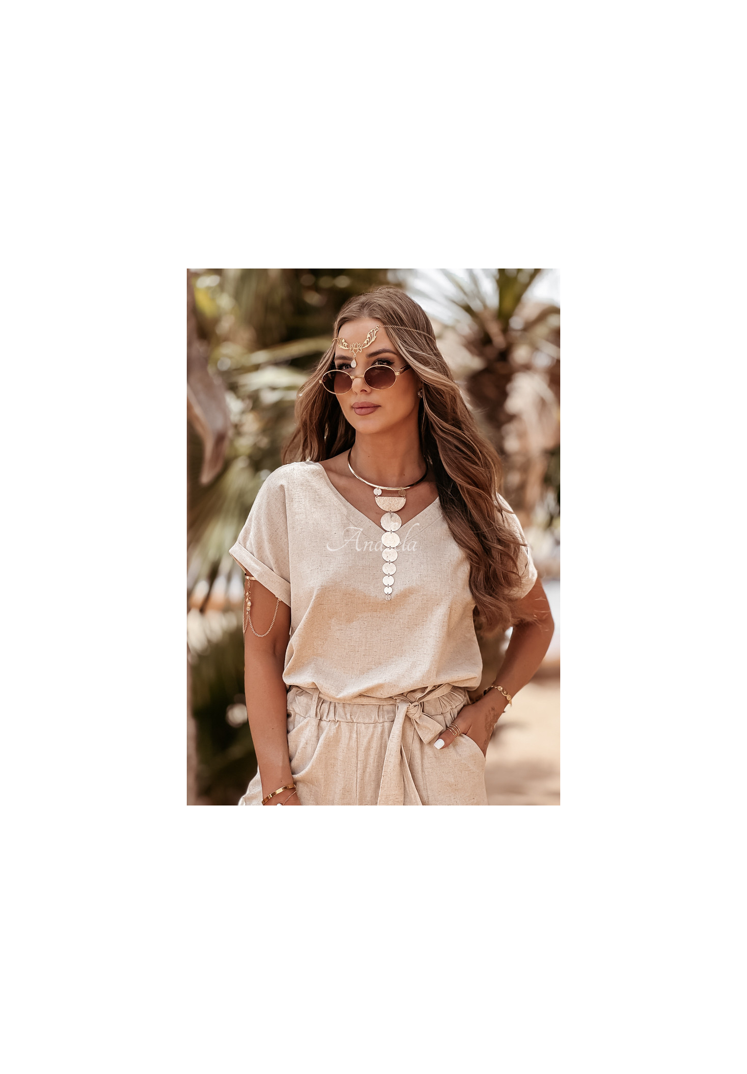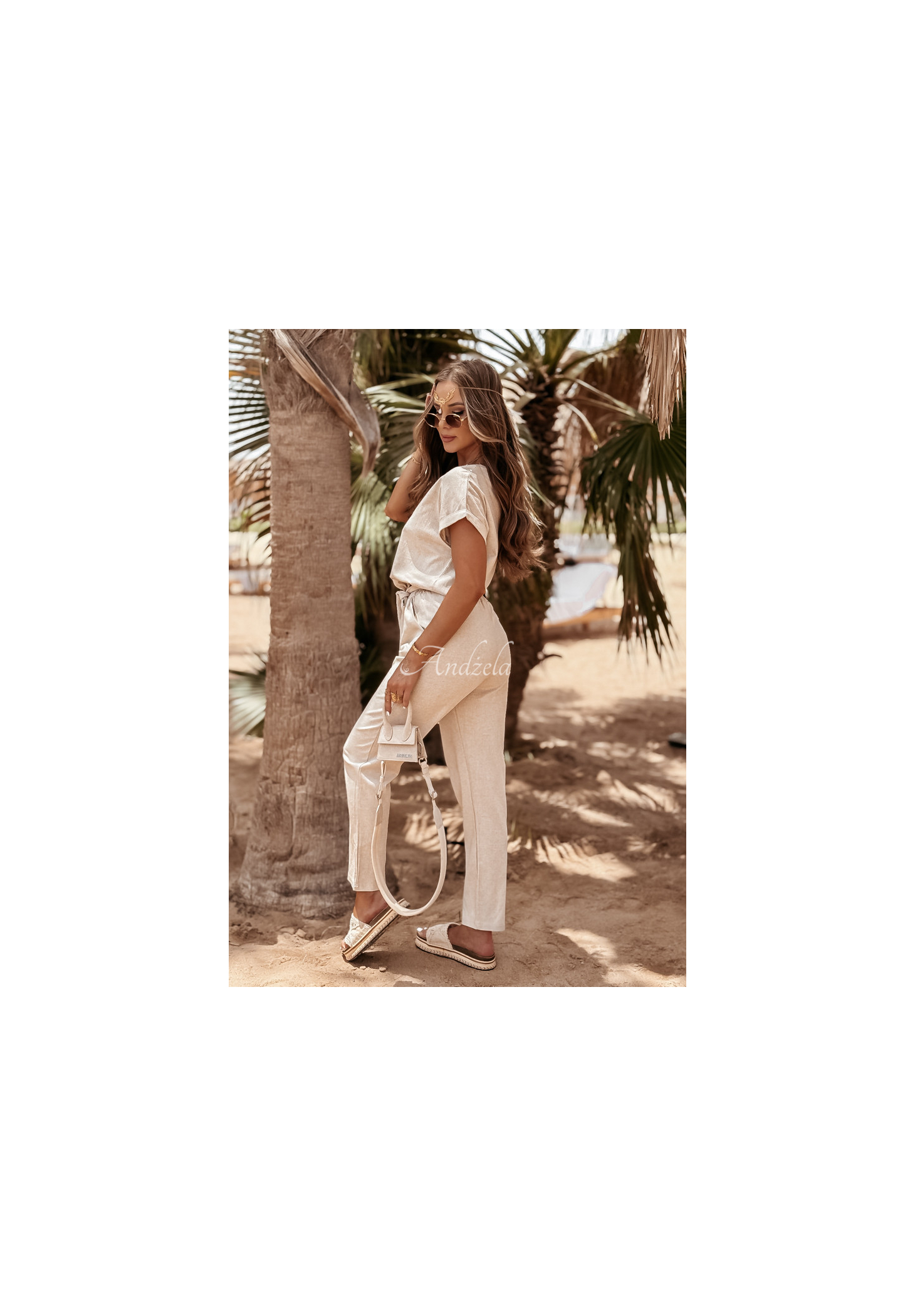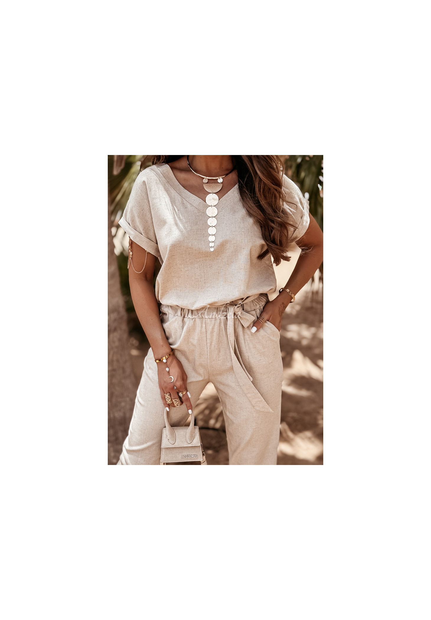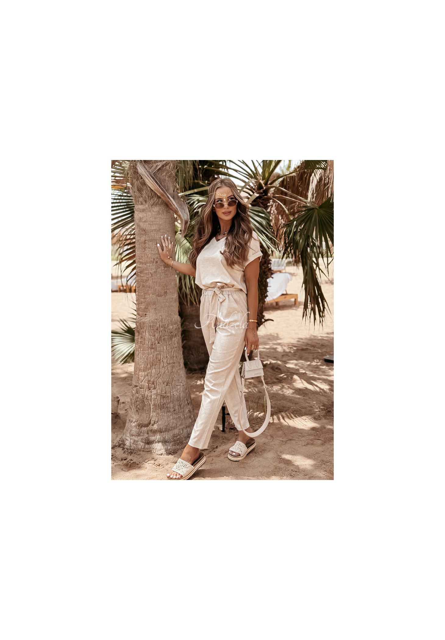 Súprava z kvalitného materiálu kombinujúceho ľan a viskózu nesmie chýbať v žiadnom letnom šatníku. Tričko klasického strihu má ženský výstrih do V a trvalo vyhrnuté rukávy. Nohavice so zúženými nohavicami sú modelom s funkčnými vreckami a gumou v páse, vďaka čomu dokonale padnú na postavu. Súčasťou je aj opasok, ktorý skvele doplní akýkoľvek look. Táto súprava je možnosťou, ktorá vám umožní vytvoriť veľa štýlov pre horúce dni.