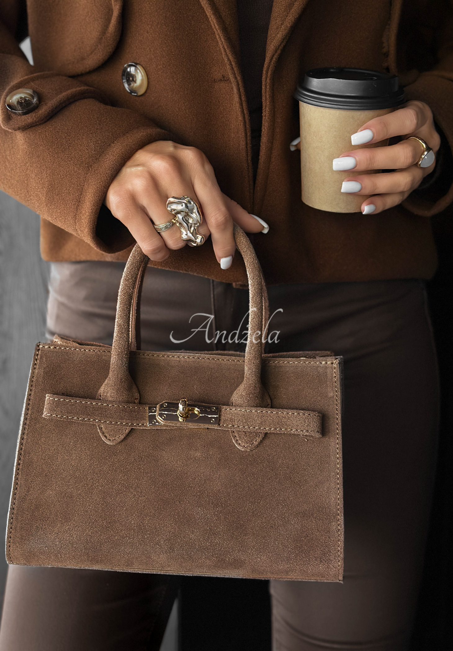Malá jednopriehradková kabelka vyrobená z prírodného semišu. Je to malý jednopriehradkový model so zapínaním na zips a jedným vnútorným vreckom. Má krátke rúčky a odnímateľný, nastaviteľný popruh.