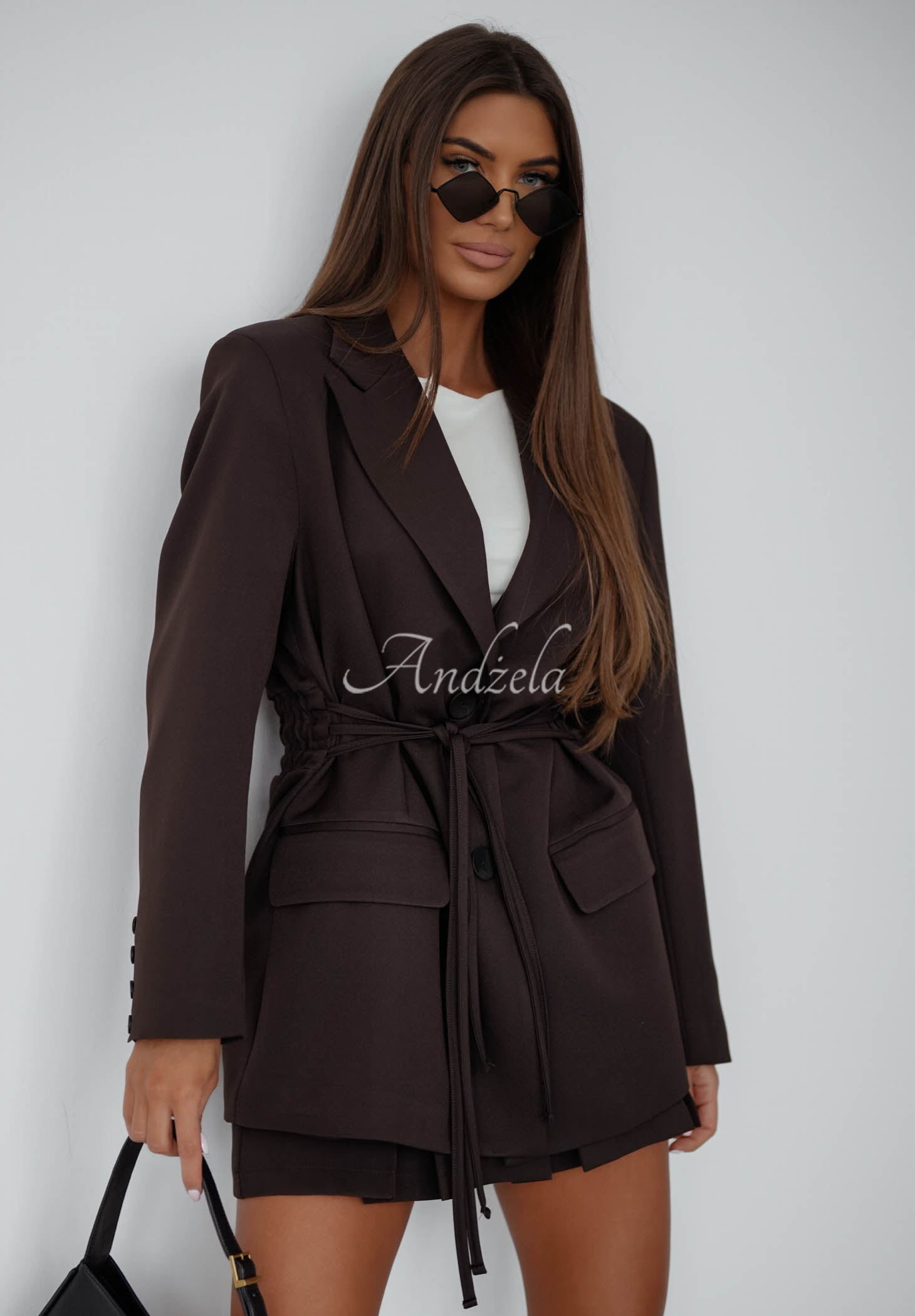 Oversize sako s golierom, vyrobené zo zmesi viskózy. Tento model má tvarujúce ramenné vypchávky. Zapína sa na gombíky a má všitú šnúrku v páse.
