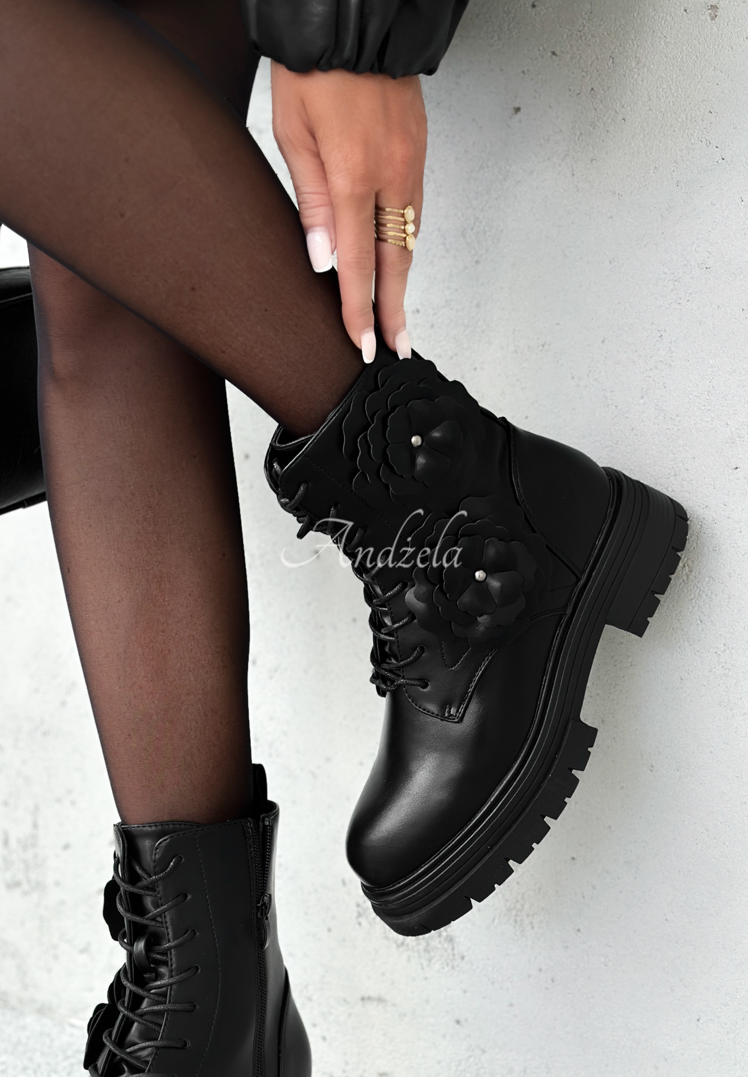 Kožené členkové čižmy s vyvýšenou podrážkou a ľahkým zateplením. Tento model má ozdobné kvety, šnurovacie a zapínanie a zips.* imitácia kože* ľahko zatepelené* šnurovanie* zapínanie na zips* zaoblená špička* ozdobné kvety* vyvýšená podrážka