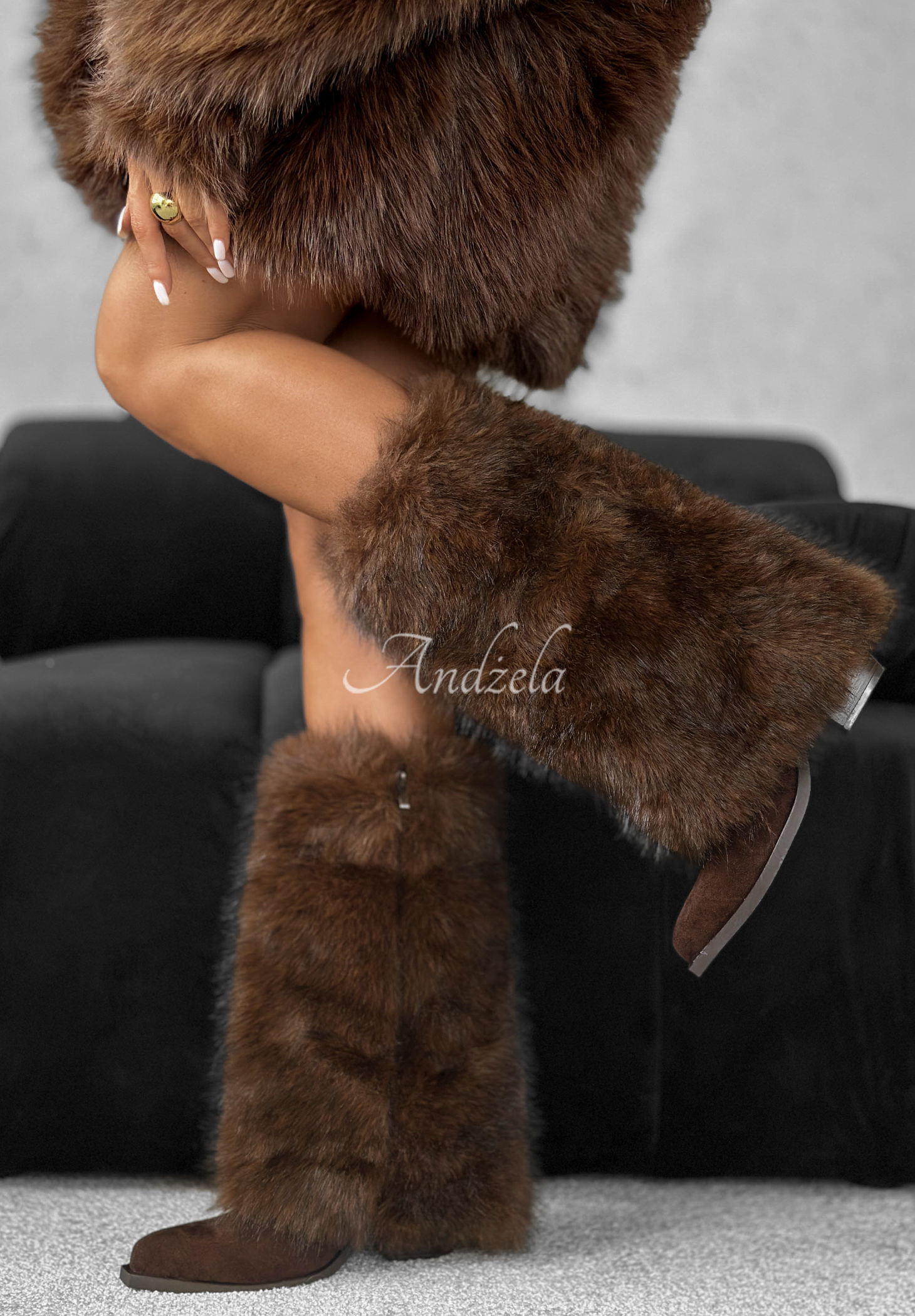 Semišové členkové čižmy so zvýšeným podpätkom. Tento model má špicatú špičku a mäkkú podšívku z umelej kožušiny. Zapínanie na bočný zips.