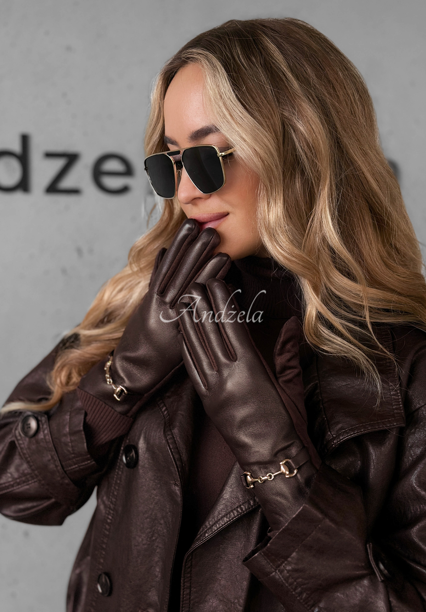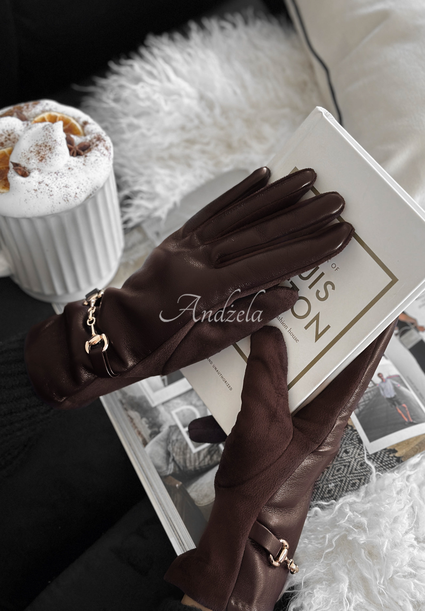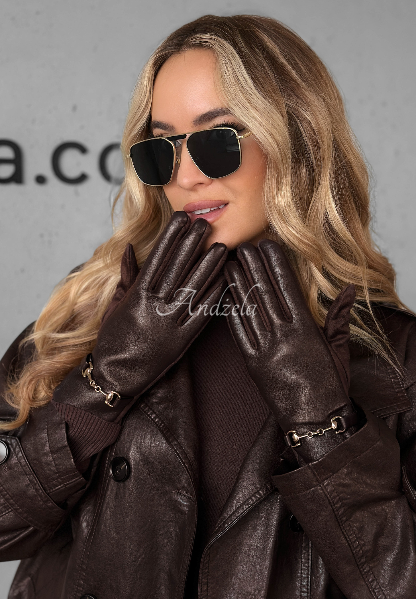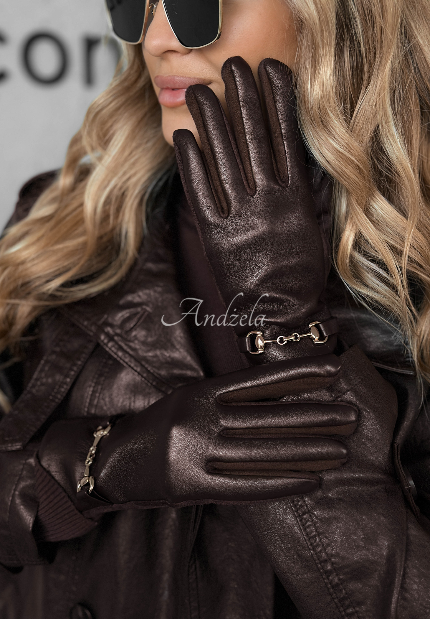 Rukavice vyrobené z kombinácie semišového materiálu a imitácie kože sú perfektným doplnkom na zimu. Model s mäkkým zateplením na vnútornej strane je ozvláštnený zlatým prvkom na zápästí. Ukazovák a palec majú navyše špeciálne aplikácie, ktoré umožňujú na používanie telefónu. Dostupné v niekoľkých farbách.
