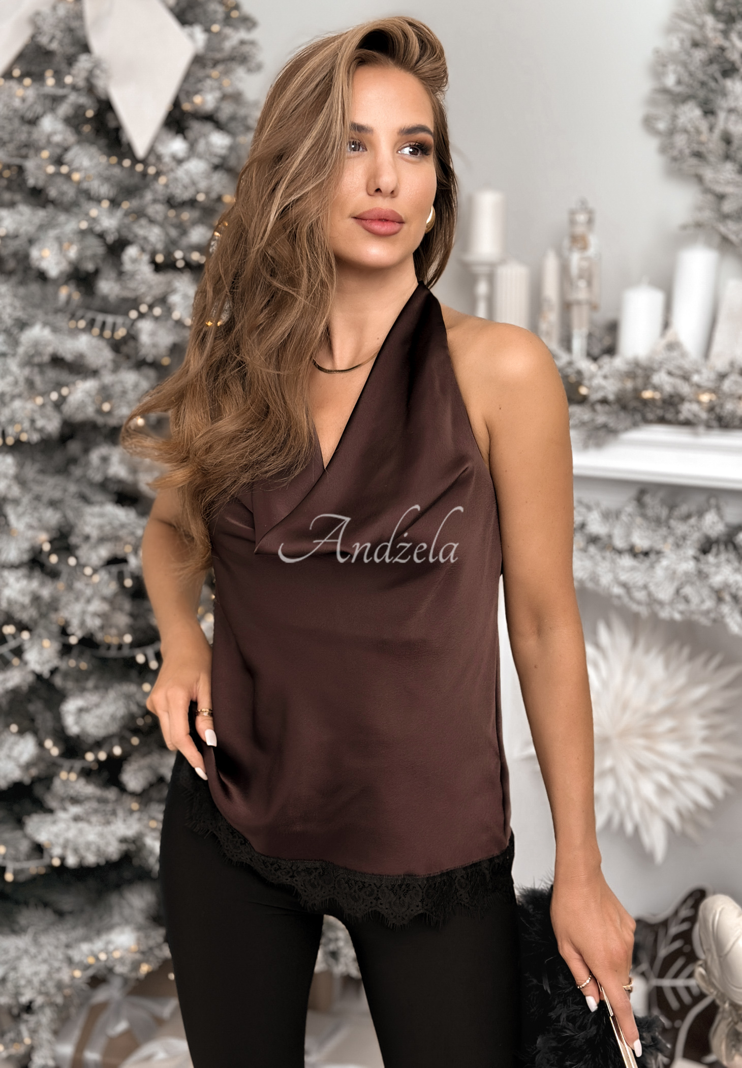 Saténový top s ramienkami s odhalenými ramenami a chrbtom. Tento štýl sa vyznačuje jemnými čipkovanými detailmi a elastickým pásom vzadu.* neelastický materiál* halter dekolt* čipka* elastický pás* odhalené ramená a chrbát