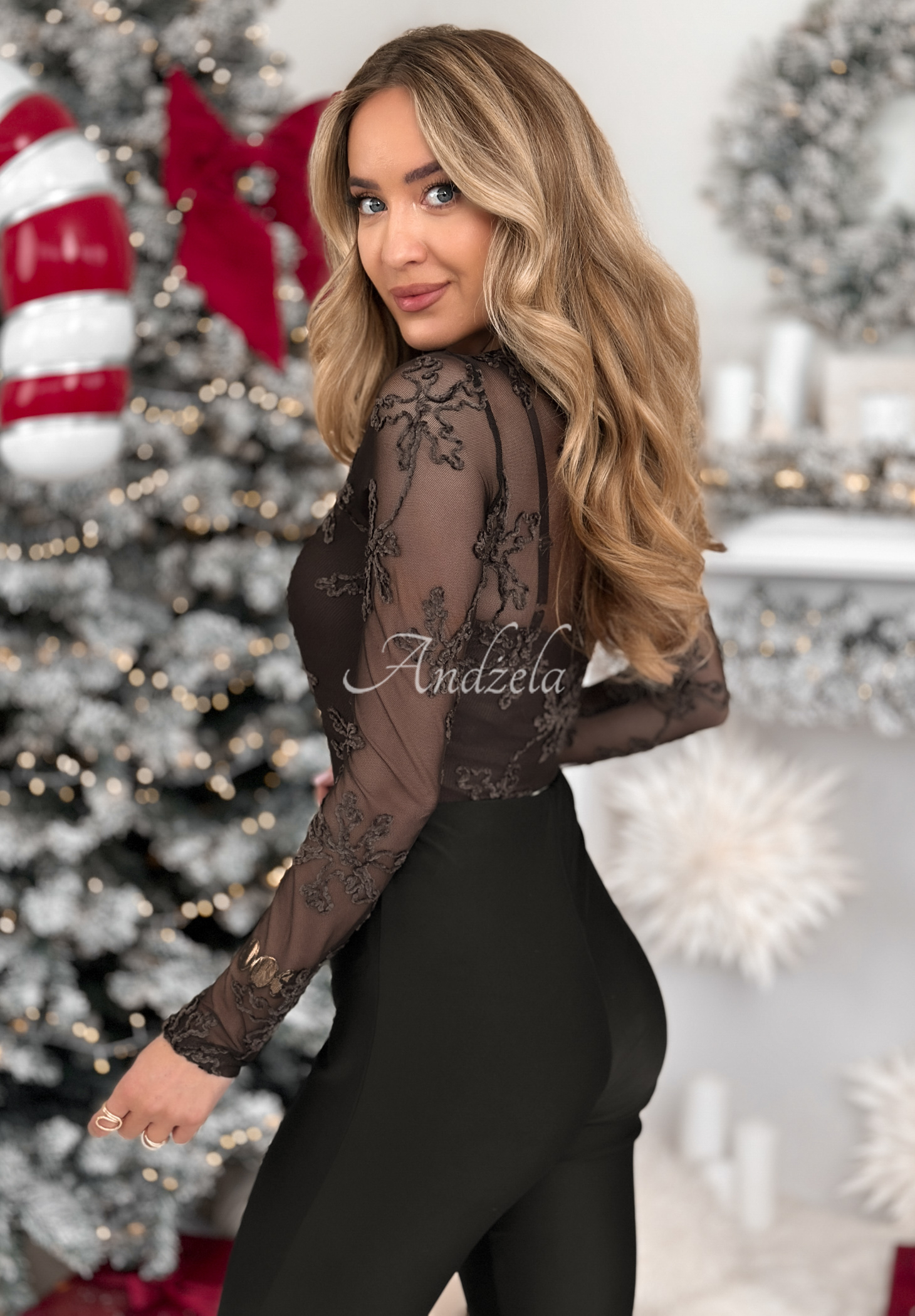 Sieťovaná blúzka s výraznou výšivkou, vyrobená z priehľadného materiálu. Tento dizajn sa vyznačuje jemným stojačikom a dlhými rukávmi. Súčasťou je aj crop top. Má vstavané košíčky a nastaviteľné ramienka.