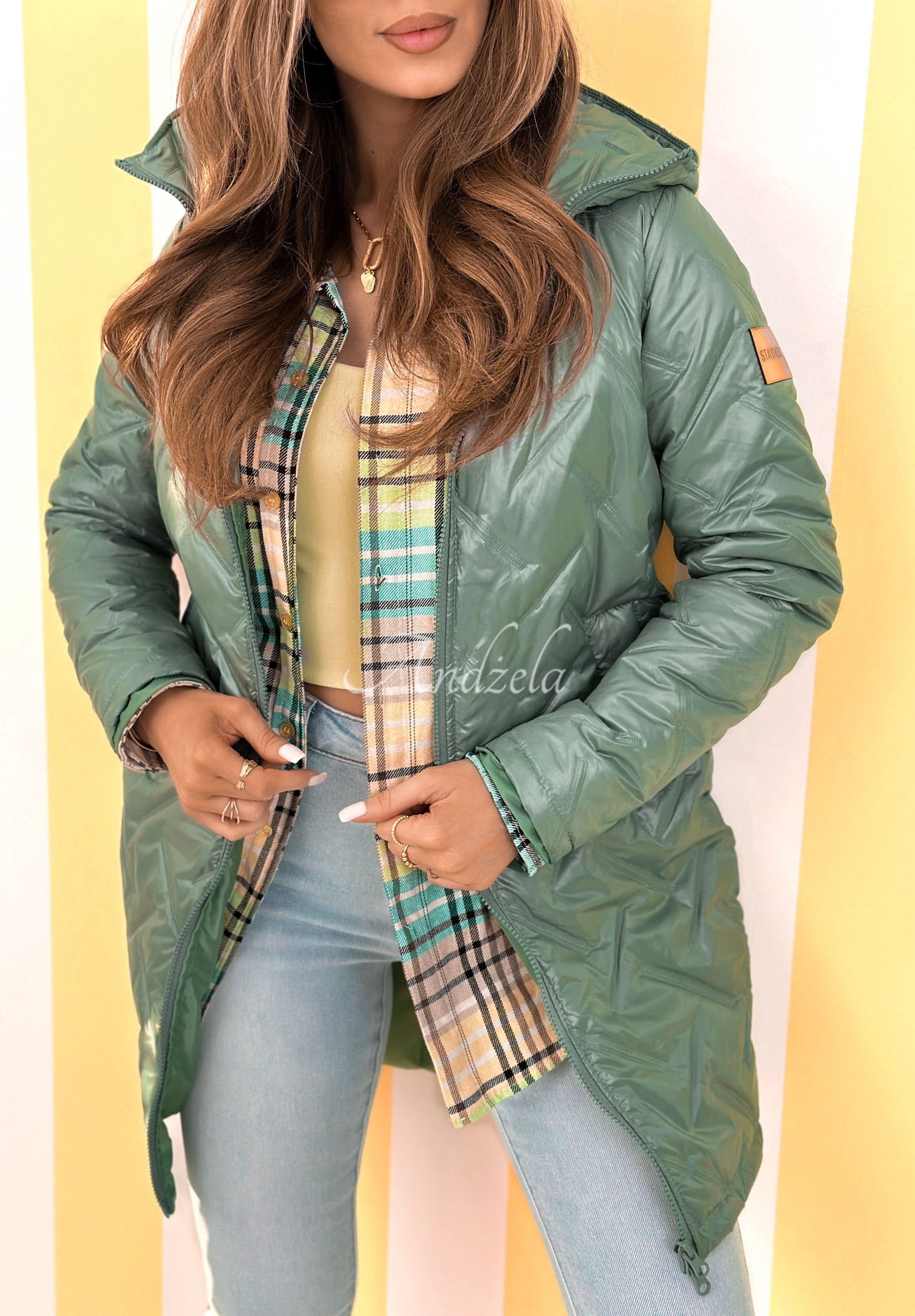 Prešívaná bunda dlhšieho strihu. Ide o asymetrický model s kapucňou a dlhými rukávmi. Jedna z nich má minimalistickú nášivku. Zapína sa na zips a vpredu má funkčné vrecká.