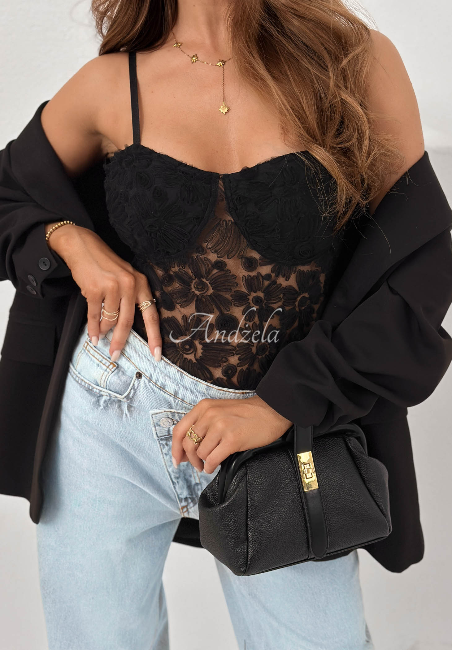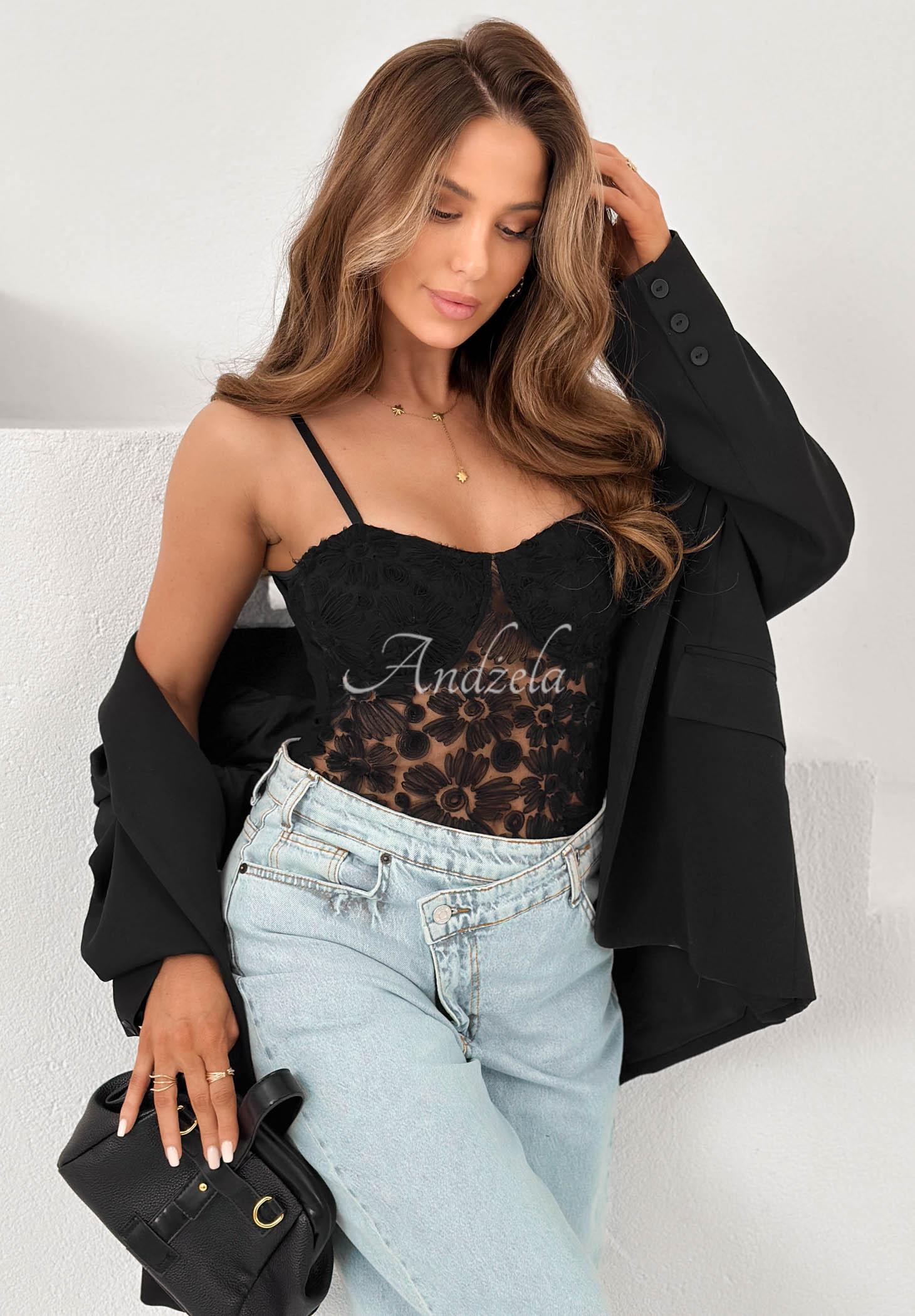 Tylové body s ramienkami, vyrobené z priehľadného materiálu. Má kvetinový vzor a vystužené košíčky. Majú nastaviteľné zapínanie na háčiky.