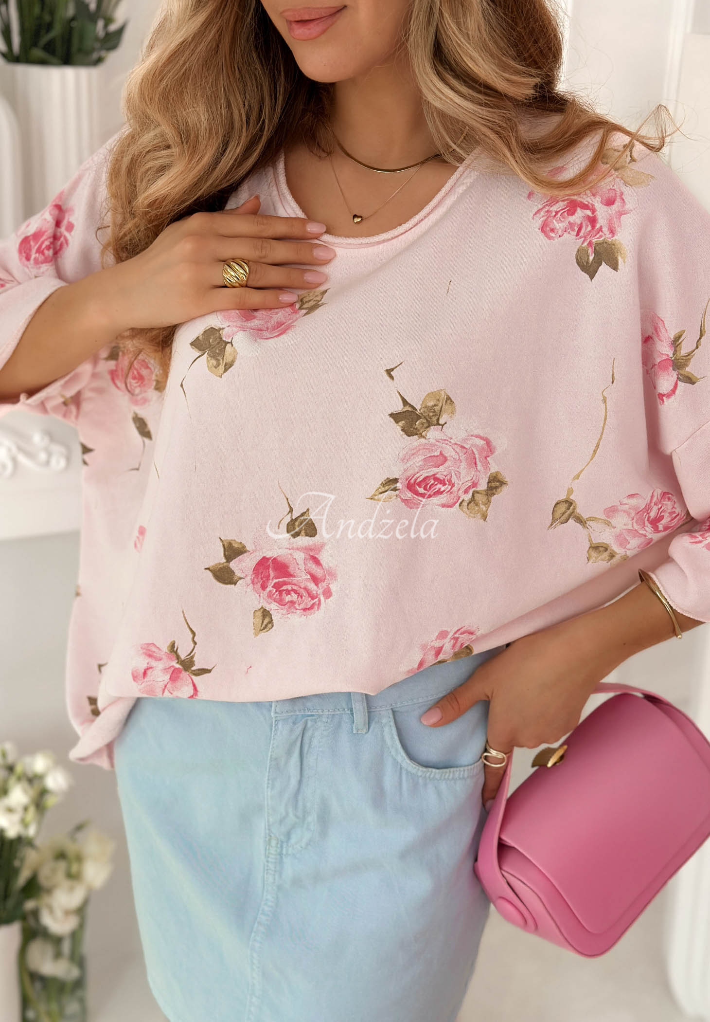 Bavlnená mikina oversize s ružami Rosanella púdrovo ružová