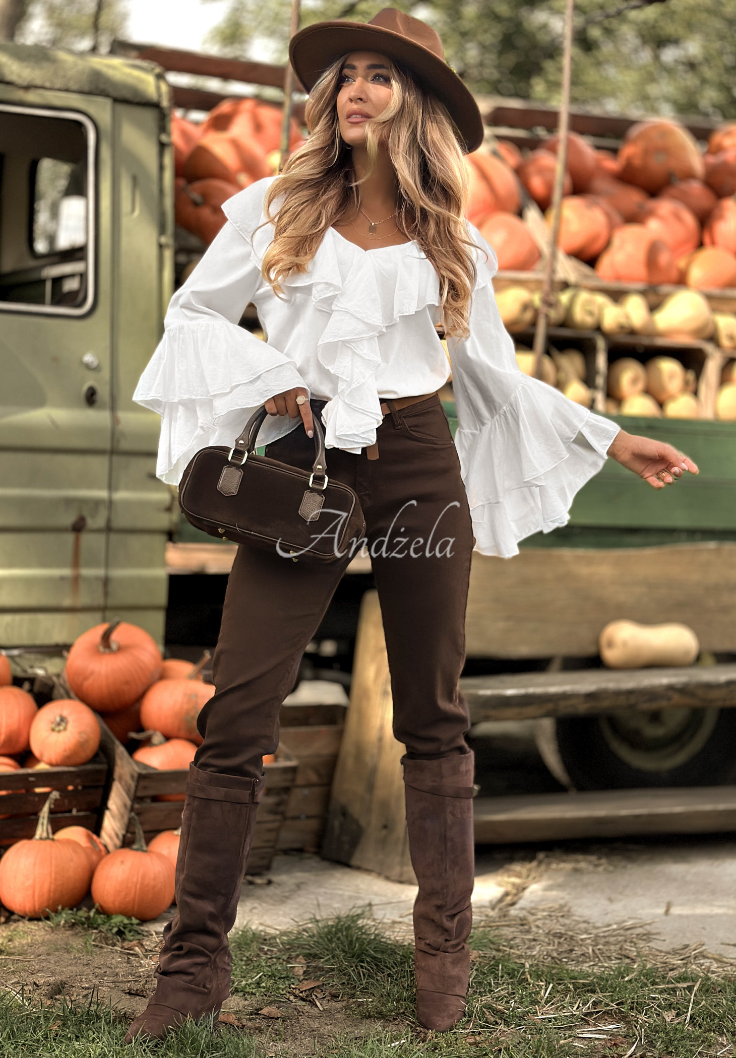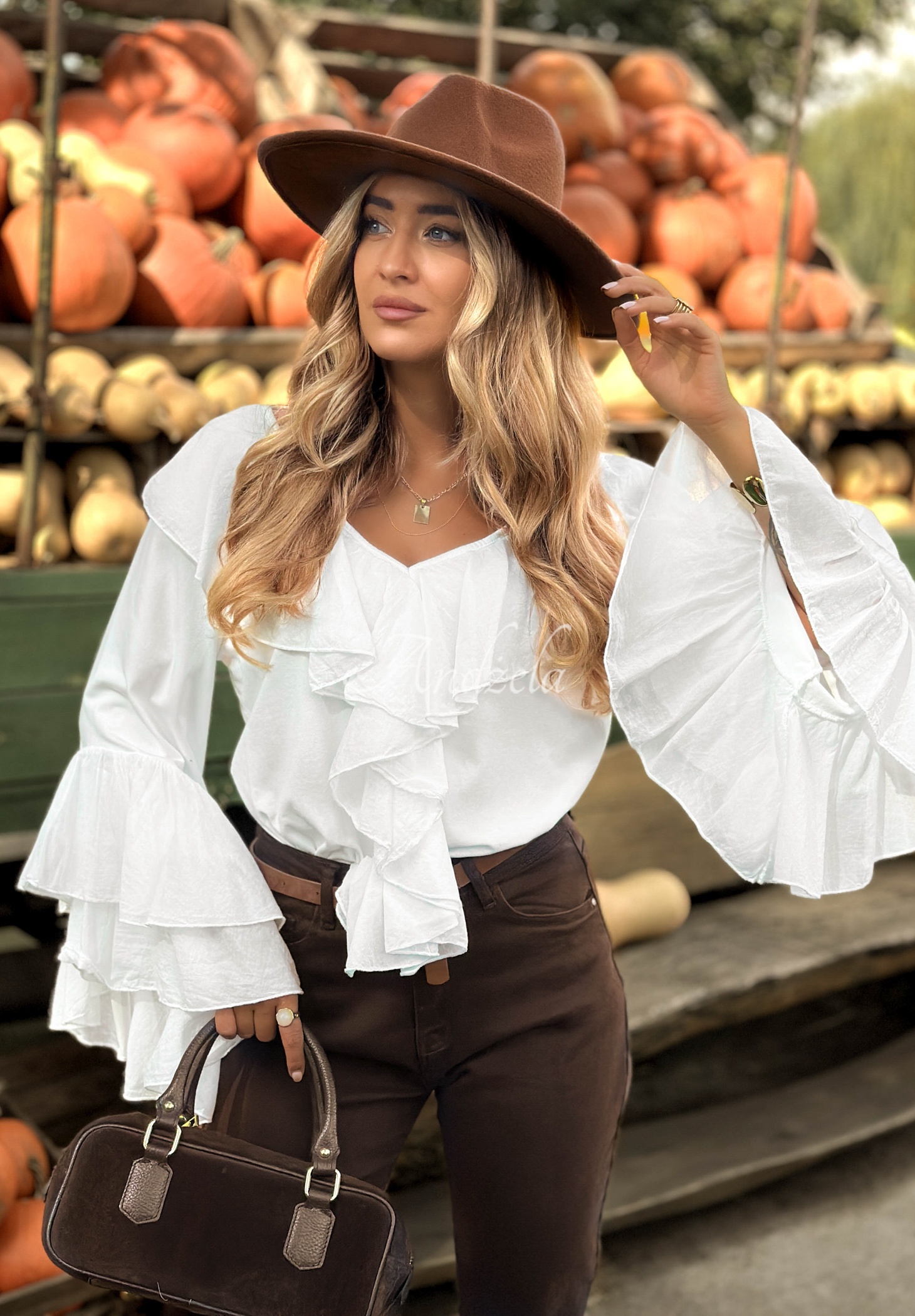 Blúzka z elastickej bavlnenej látky. Tento model sa vyznačuje výraznými volánikmi na prednej strane a rukávoch.