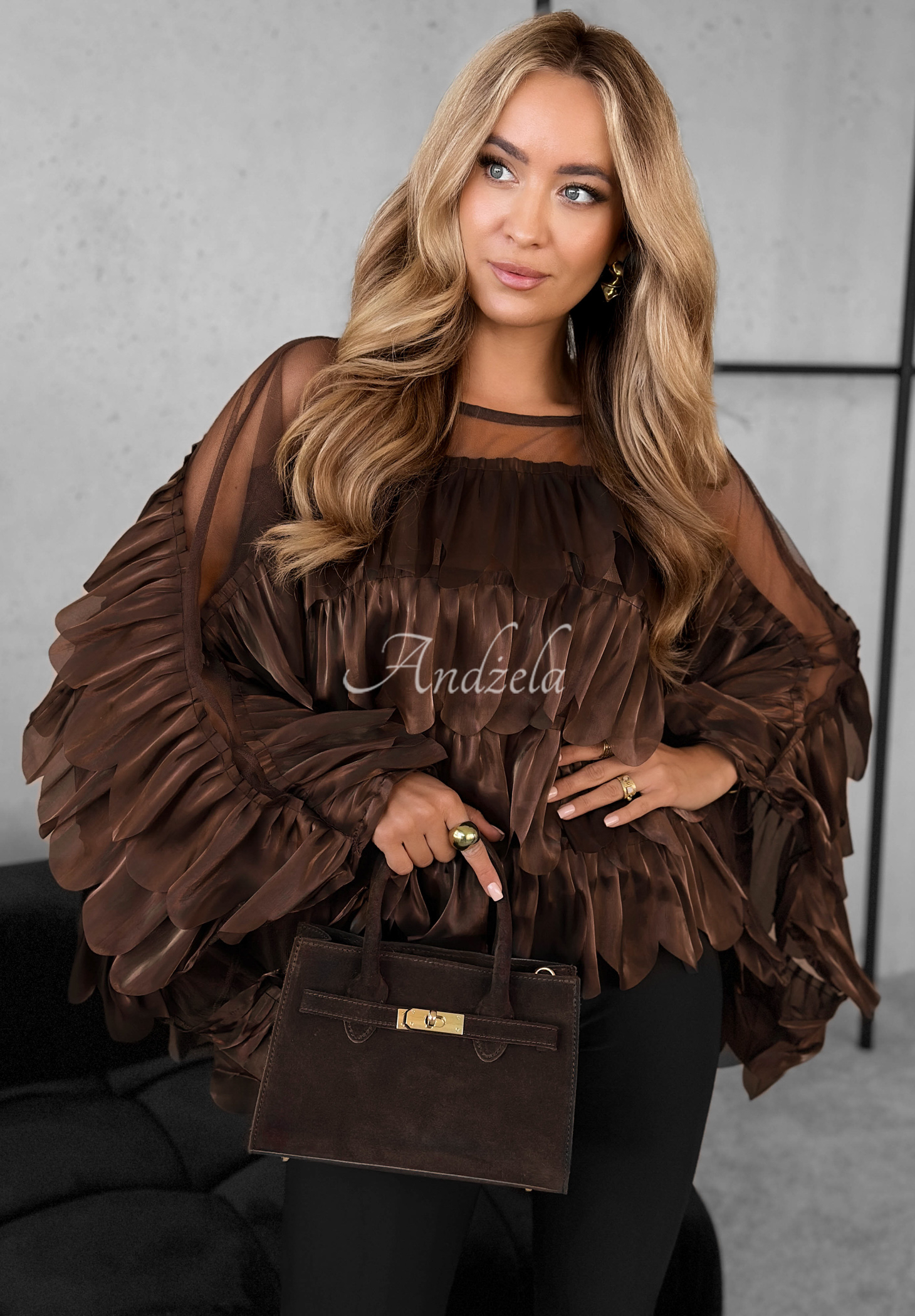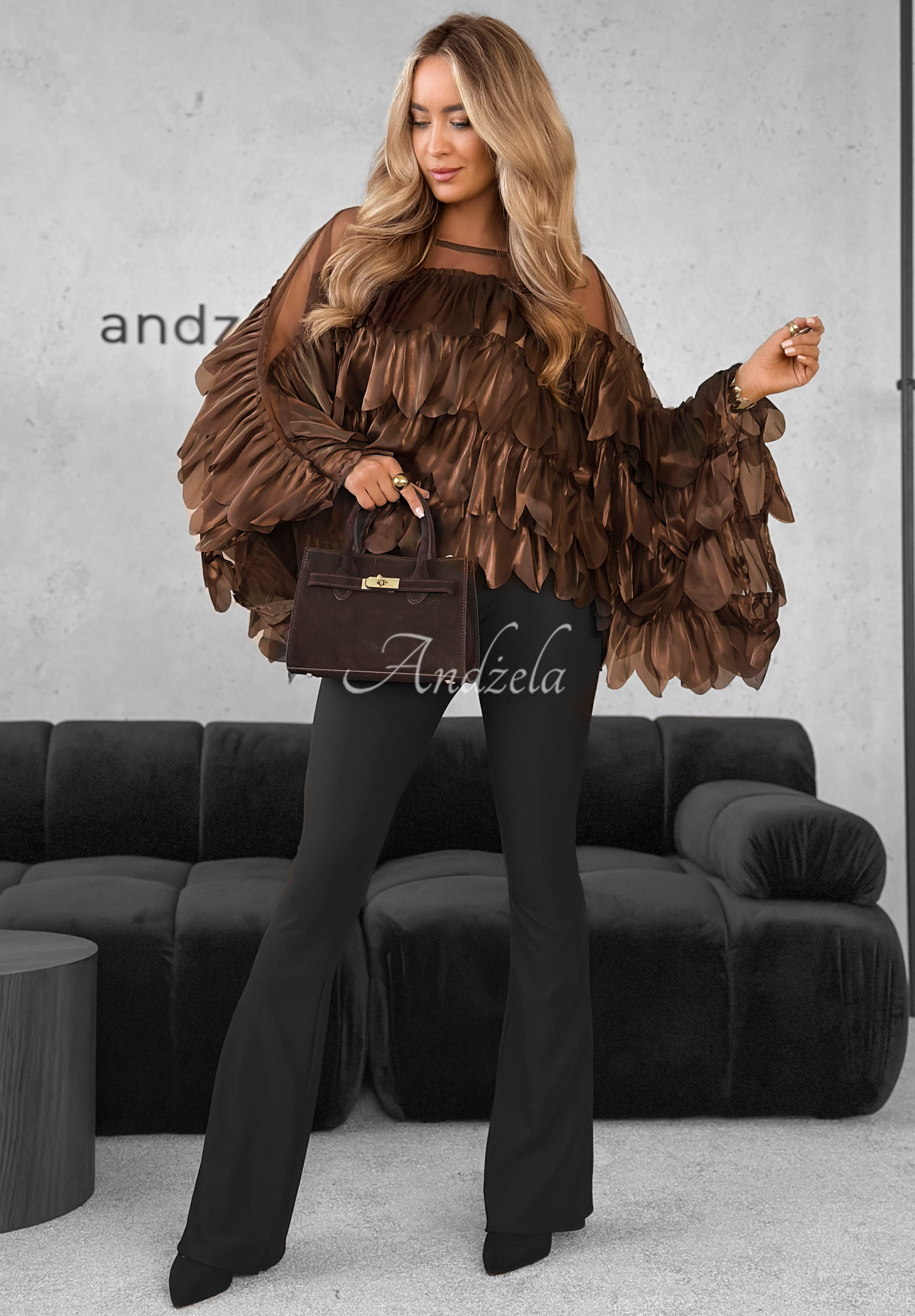 Viskózová blúzka z tylu, lemovaná splývavými volánikmi po celej dĺžke. Tento kratší strih má okrúhly výstrih a široké rukávy.* nepružný materiál* volániky* okrúhly výstrih* široké rukávy* kratší strih