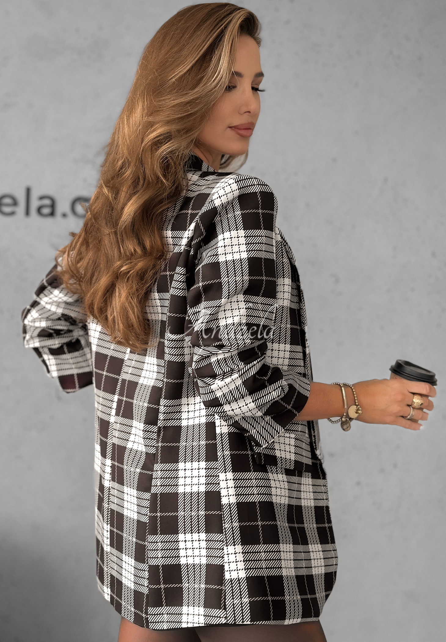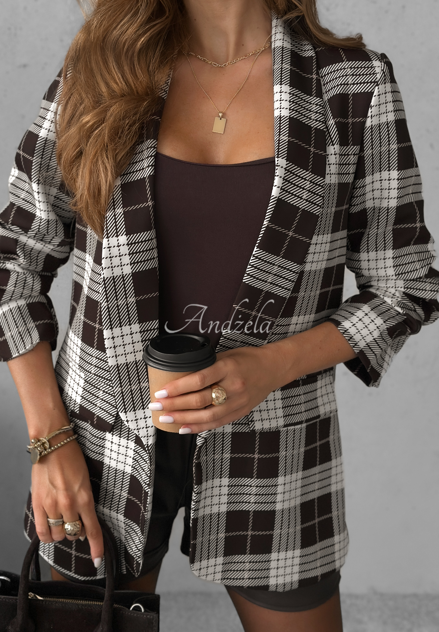 Viskózové sako so štýlovým károvaným vzorom. Tento klasický strih s otvoreným predným dielom má kratšie, nariasené rukávy. Má golier a podšívku a vpredu falošné vrecká.
