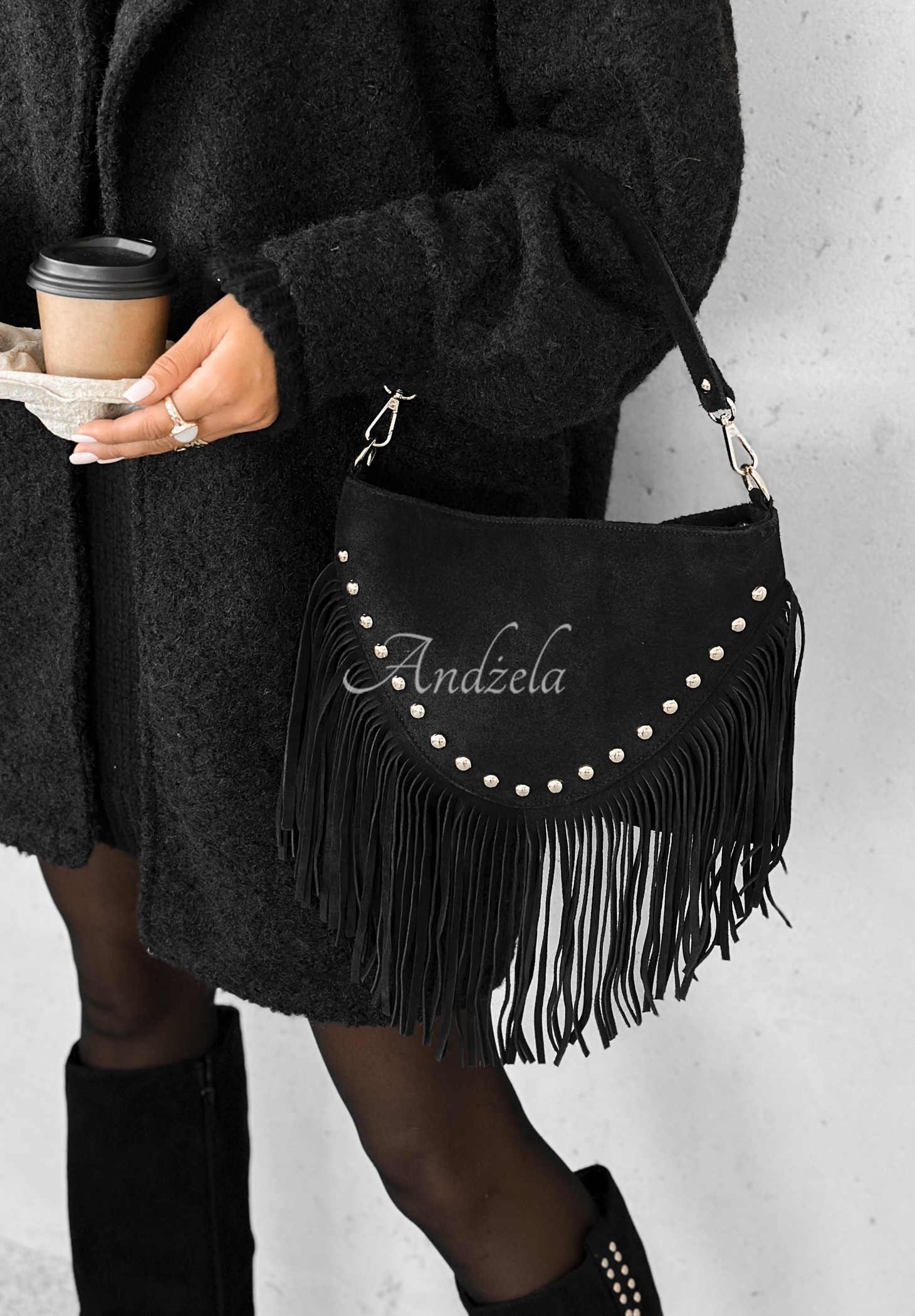 Semišová kabelka je vyrobená z vysoko kvalitnej prírodnej kože. Má jednu priehradku so zapínaním na zips a funkčné vrecko na zips vo vnútri. Má tiež kratšiu rukoväť a nastaviteľný, odnímateľný popruh. Model dotvárajú zlaté detaily a ozdobné strapce.