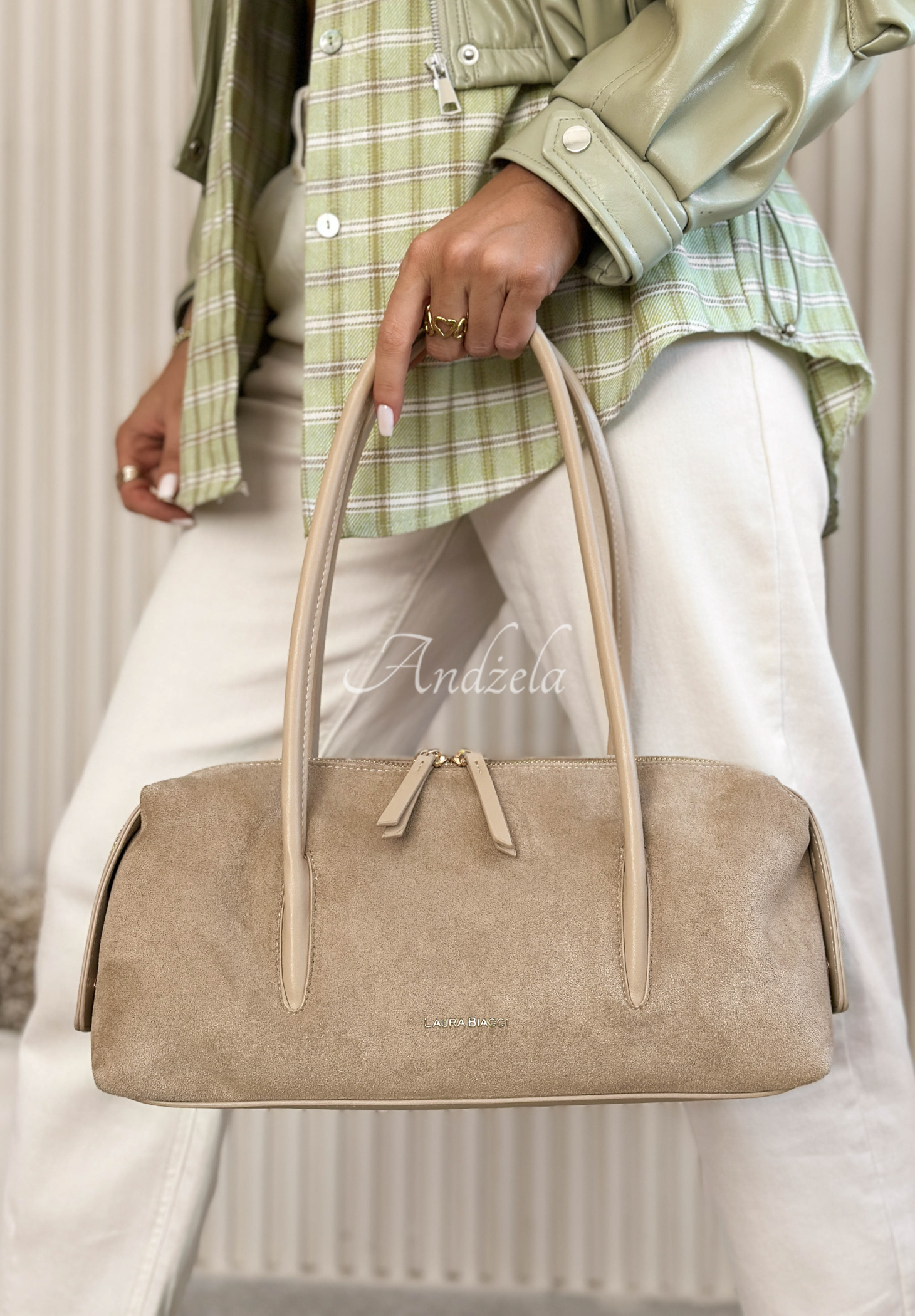 Táto kabelka je vyrobená z umelého semišu. Má jednu priehradku so zapínaním na zips a funkčné vrecká vo vnútri. Má dlhšie, neodnímateľné ucho. Zlaté detaily dotvárajú dizajn.