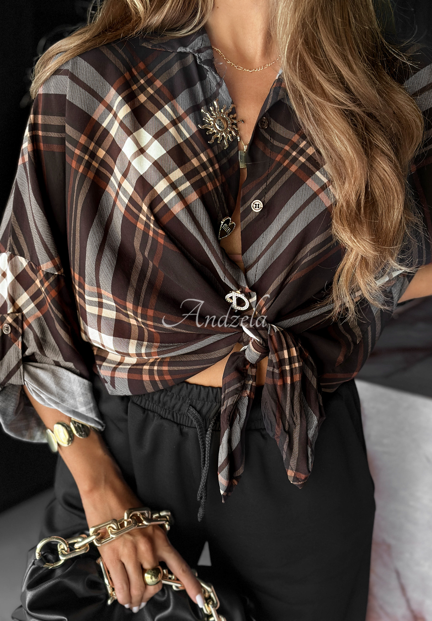 Klasická kockovaná košeľa z ľahkej viskózovej látky. Má golier a zapínanie na gombíky. Má nastaviteľné rukávy. Tento dizajn sa vyznačuje ozdobnými, odnímateľnými brošňami.