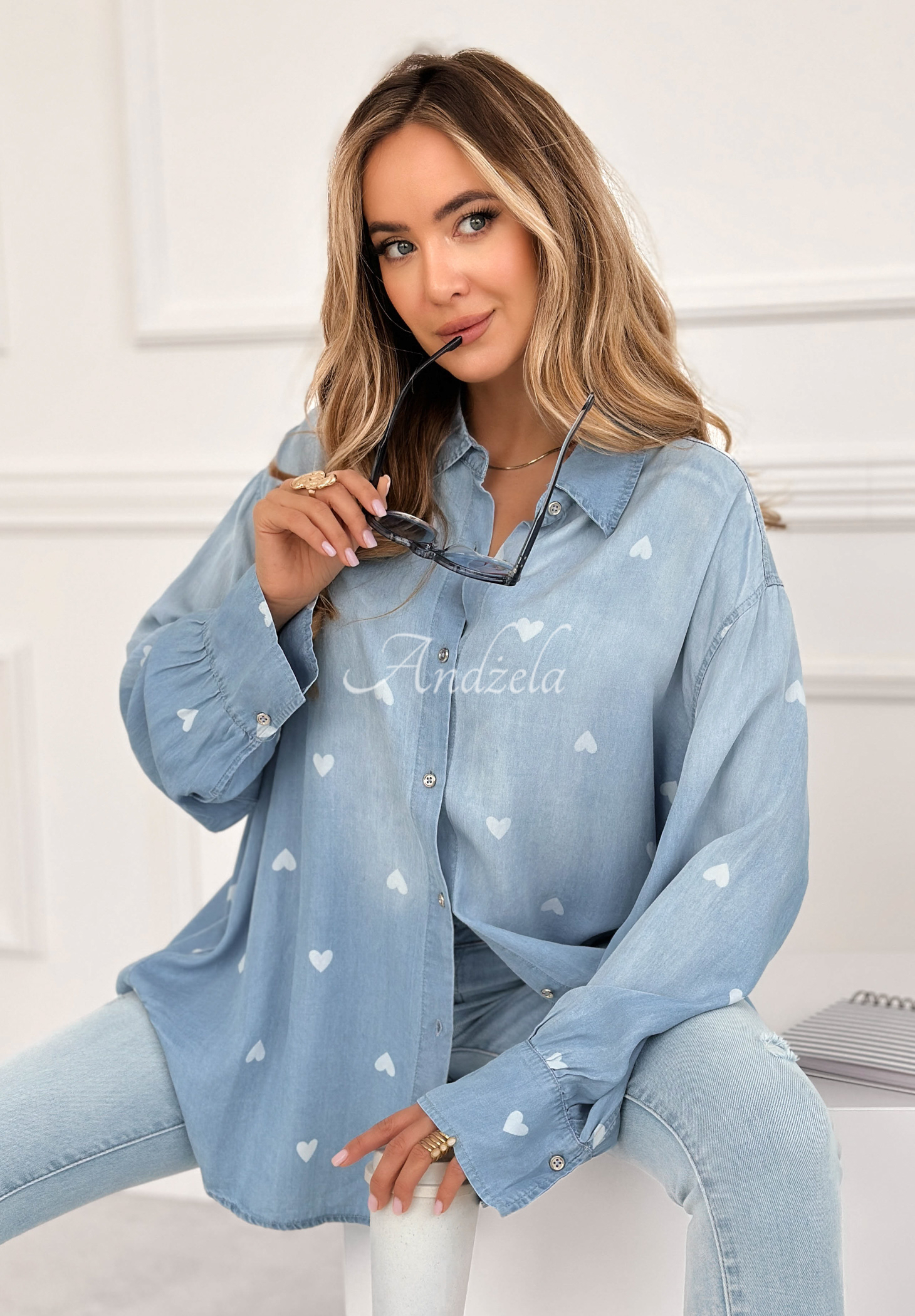 Džínsová košeľa je vyrobená z bavlny s prímesou tencelu. Má asymetrický strih a klasické zapínanie goliera so striebornými gombíkmi. Dlhé rukávy sú široké a majú manžety. Celok zdobí potlačený vzor srdiečok.