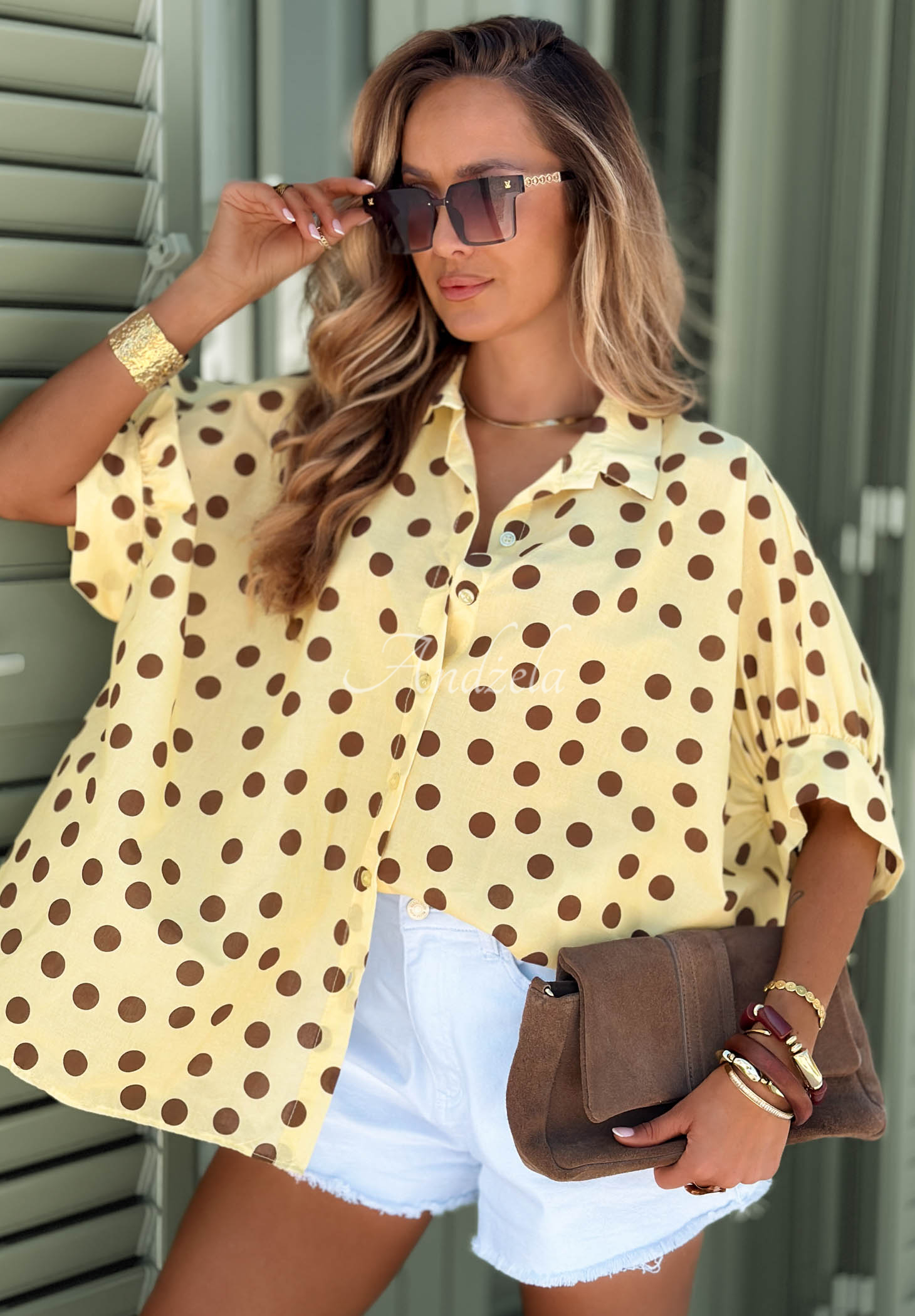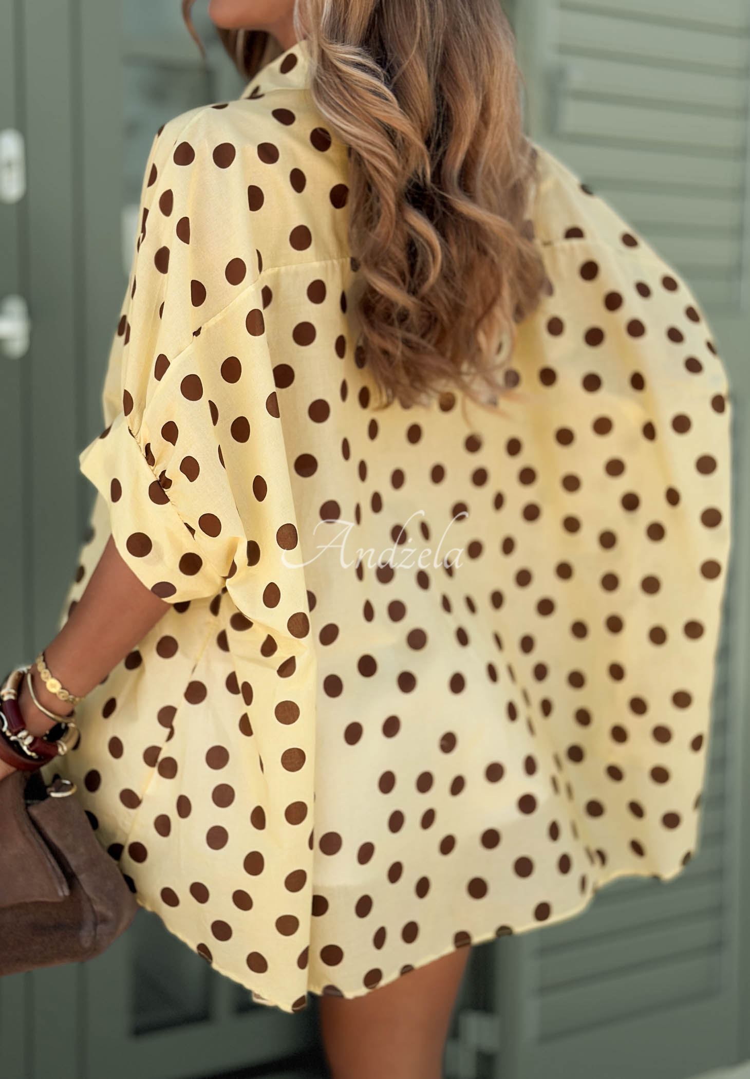 Ľahká bodkovaná košeľa z bavlnenej látky. Má oversize strih s dlhším chrbtom. Zapína sa na rad gombíkov, má krátke rukávy so širokými manžetami a golier.