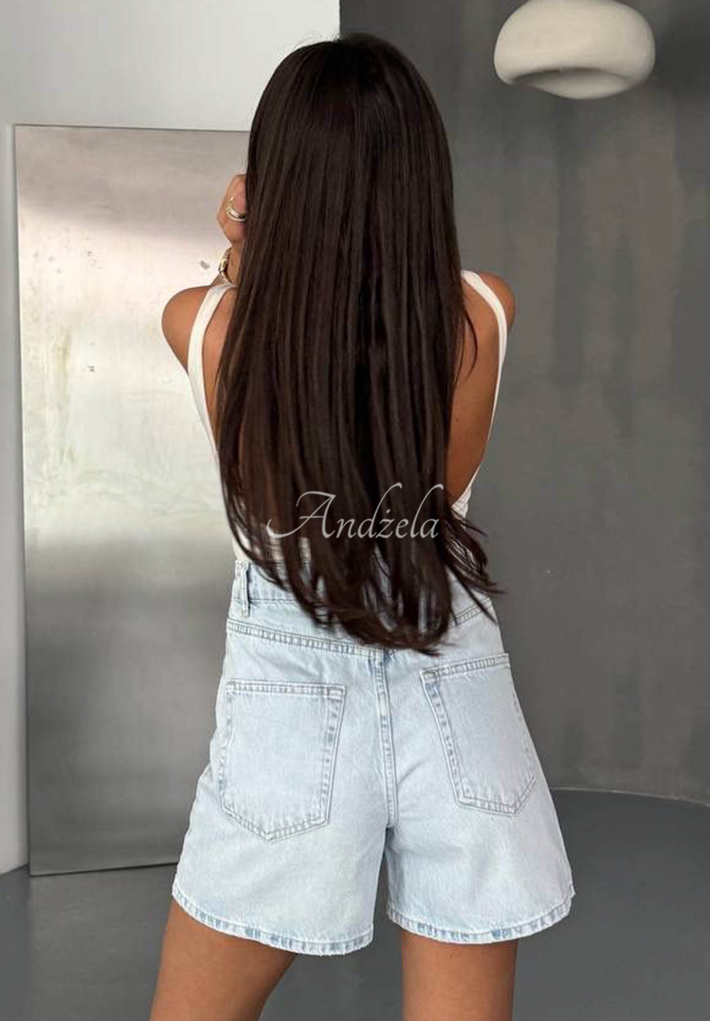 Džínsové šortky vyrobené z nepružnej bavlnenej látky. Tento model má pútka na opasok a zapínanie na zips a gombík. Funkčné vrecká sú na prednej aj zadnej strane.