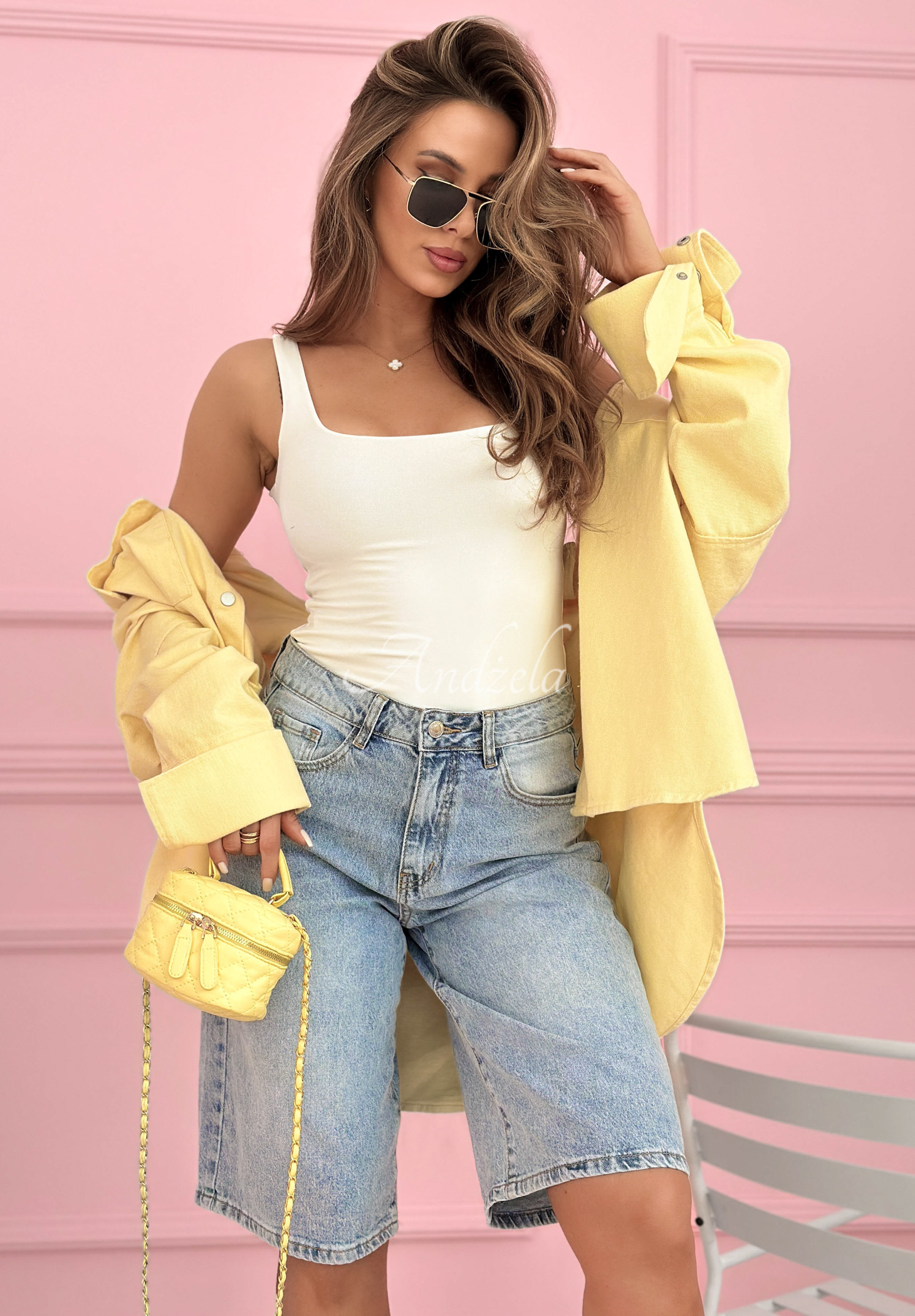 Džínsové bermudy s odreninami majú zadné vrecká zdobené kryštálmi. Tento model s vysokým pásom sa zapína na zips a gombík.