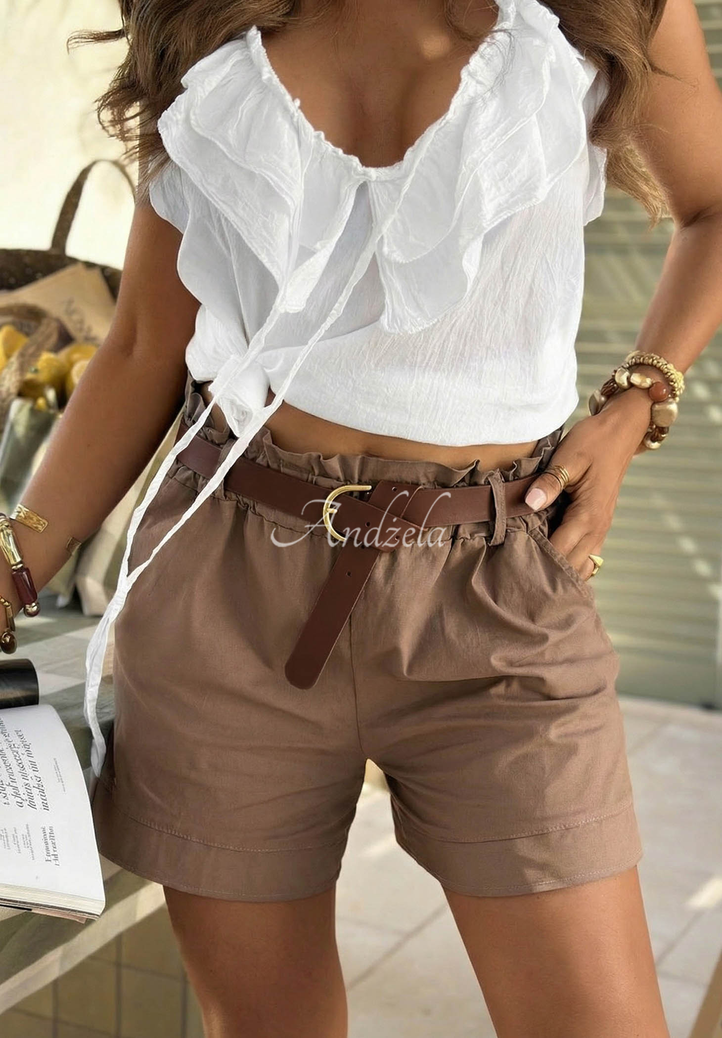 Šortky z elastického bavlneného materiálu. Ide o model s elastickým pásom a funkčnými vreckami na prednej strane. Súčasťou je opasok z imitácie kože so zlatou prackou.
