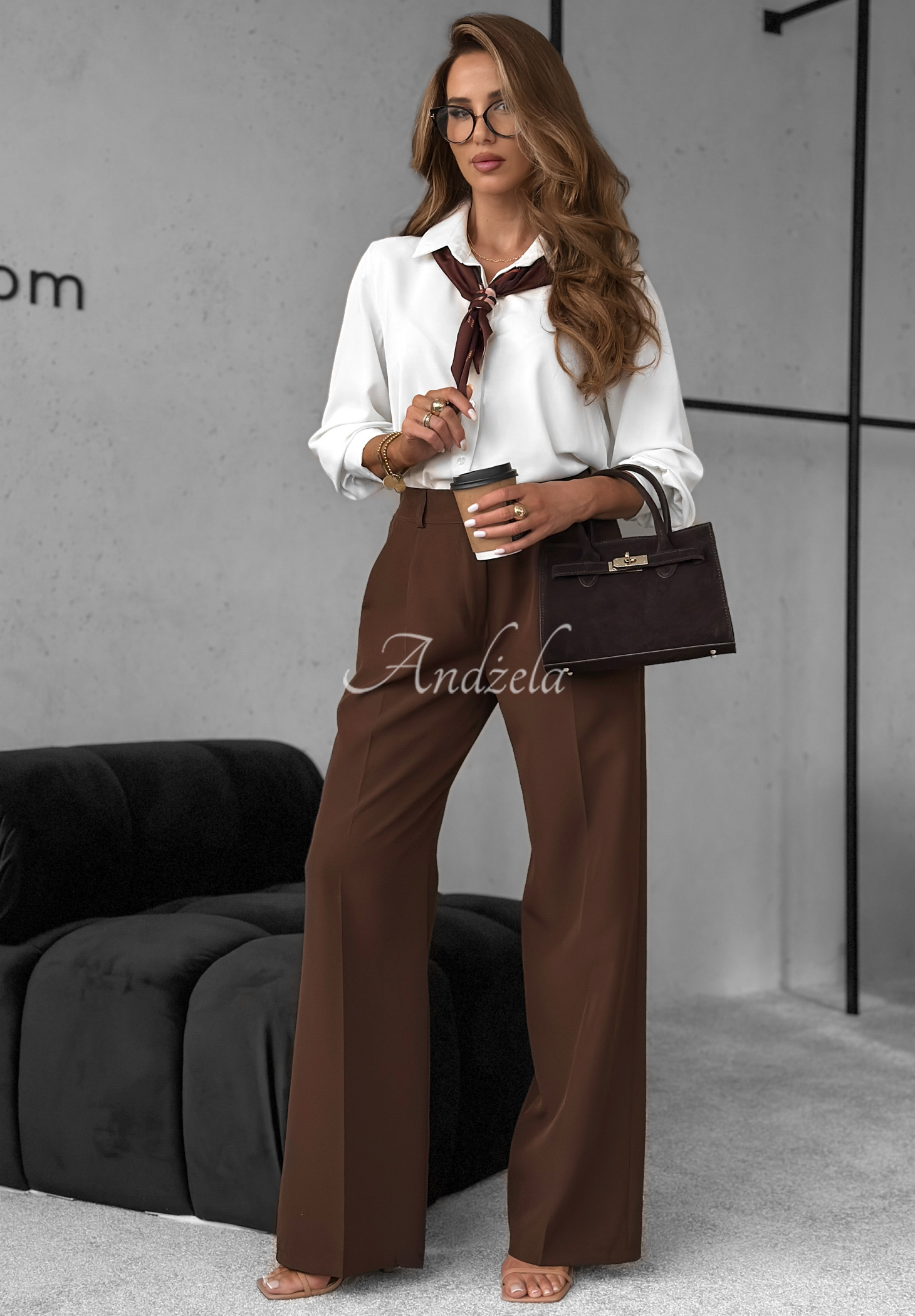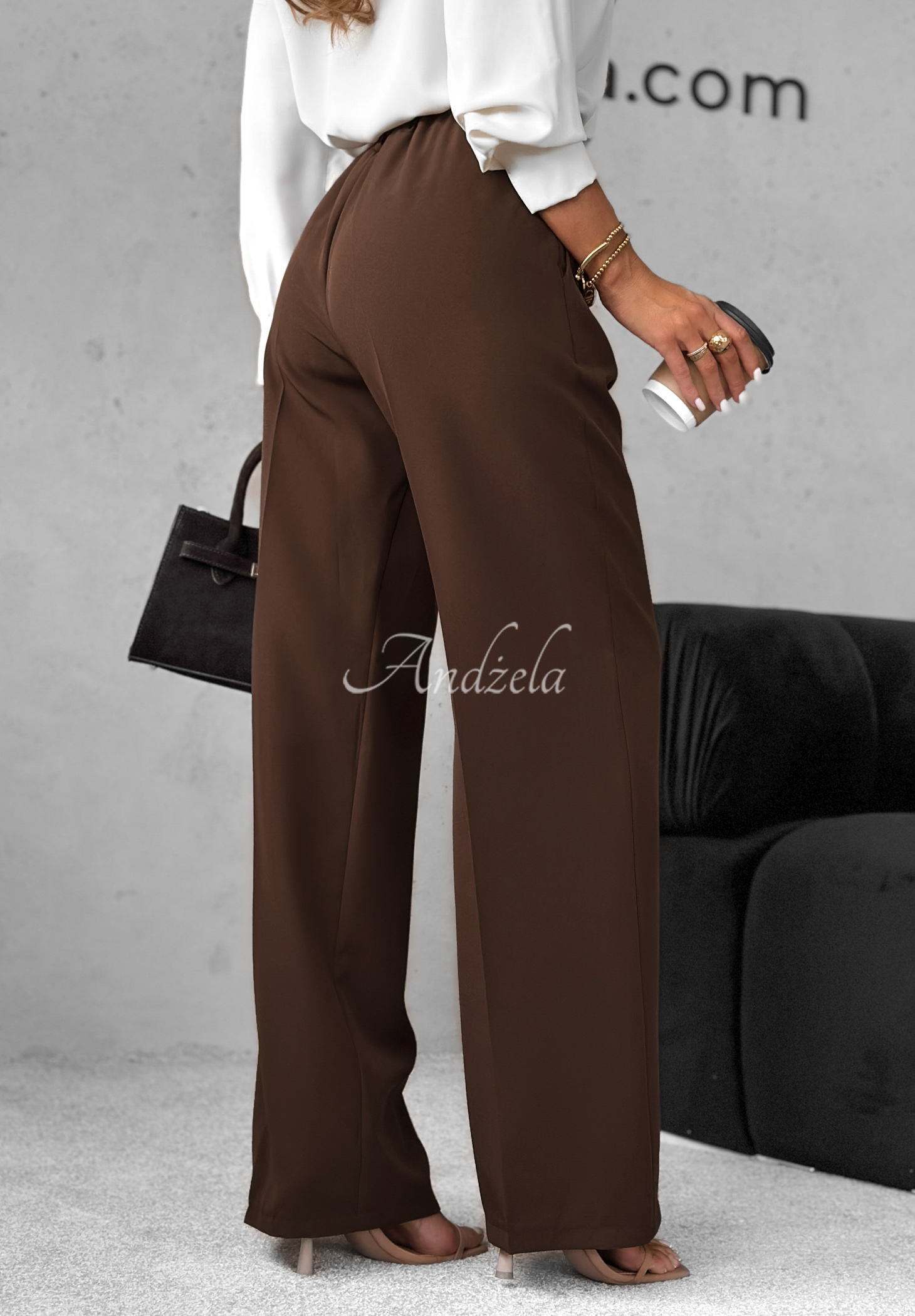 Široké nohavice z ľahkej látky. Tento model má široké, riasené nohavice a vysoký pás. Zapína sa na zips a gombík a má elastický pás. Funkčné vrecká sa nachádzajú vpredu.