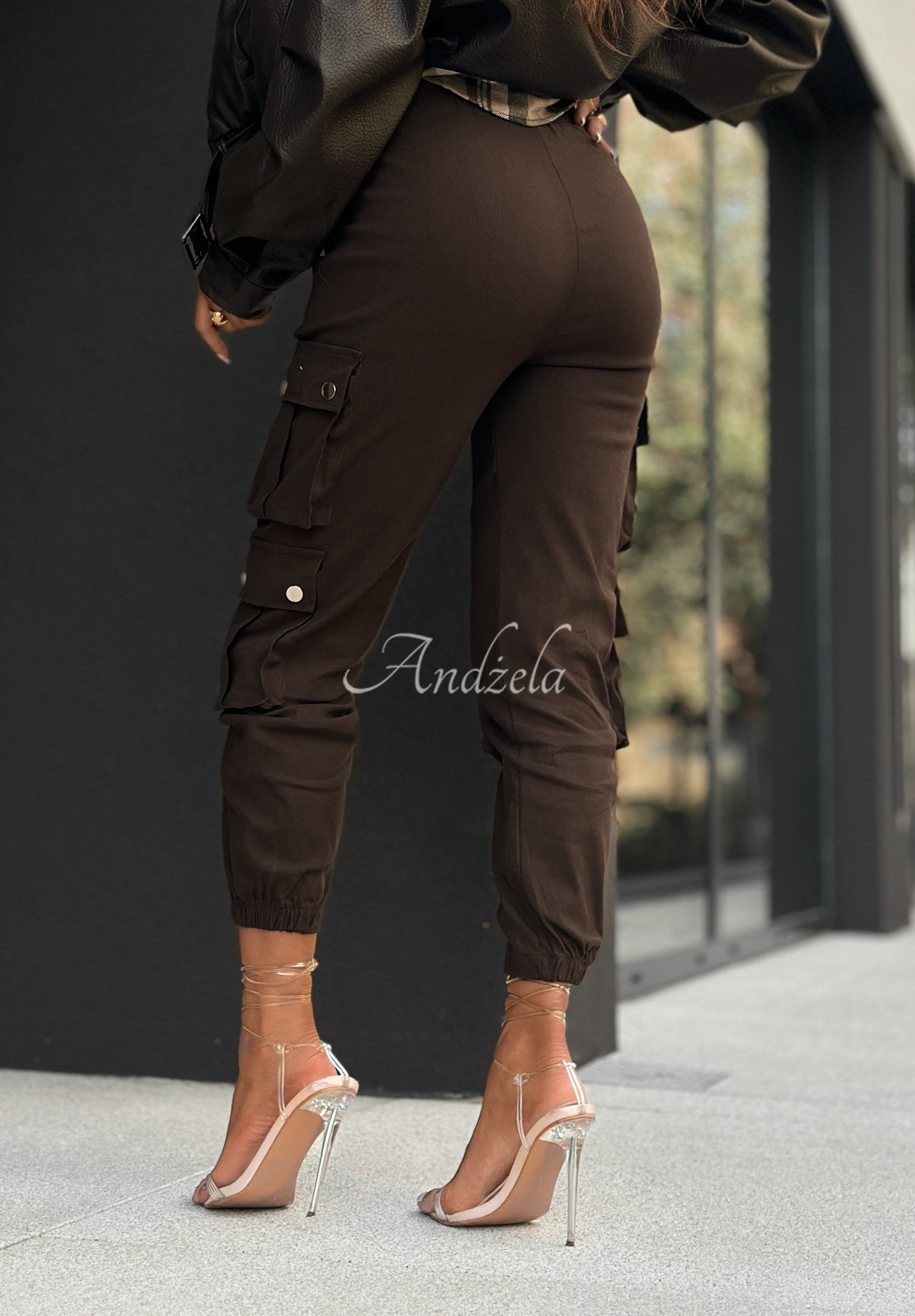 Nohavice vyrobené z elastickej viskózovej látky. Tento model s vysokým pásom má elastický pás so sťahovacou šnúrkou. Vpredu a vzadu sú funkčné vrecká. Nohavice sú zakončené sťahovacími šnúrkami.