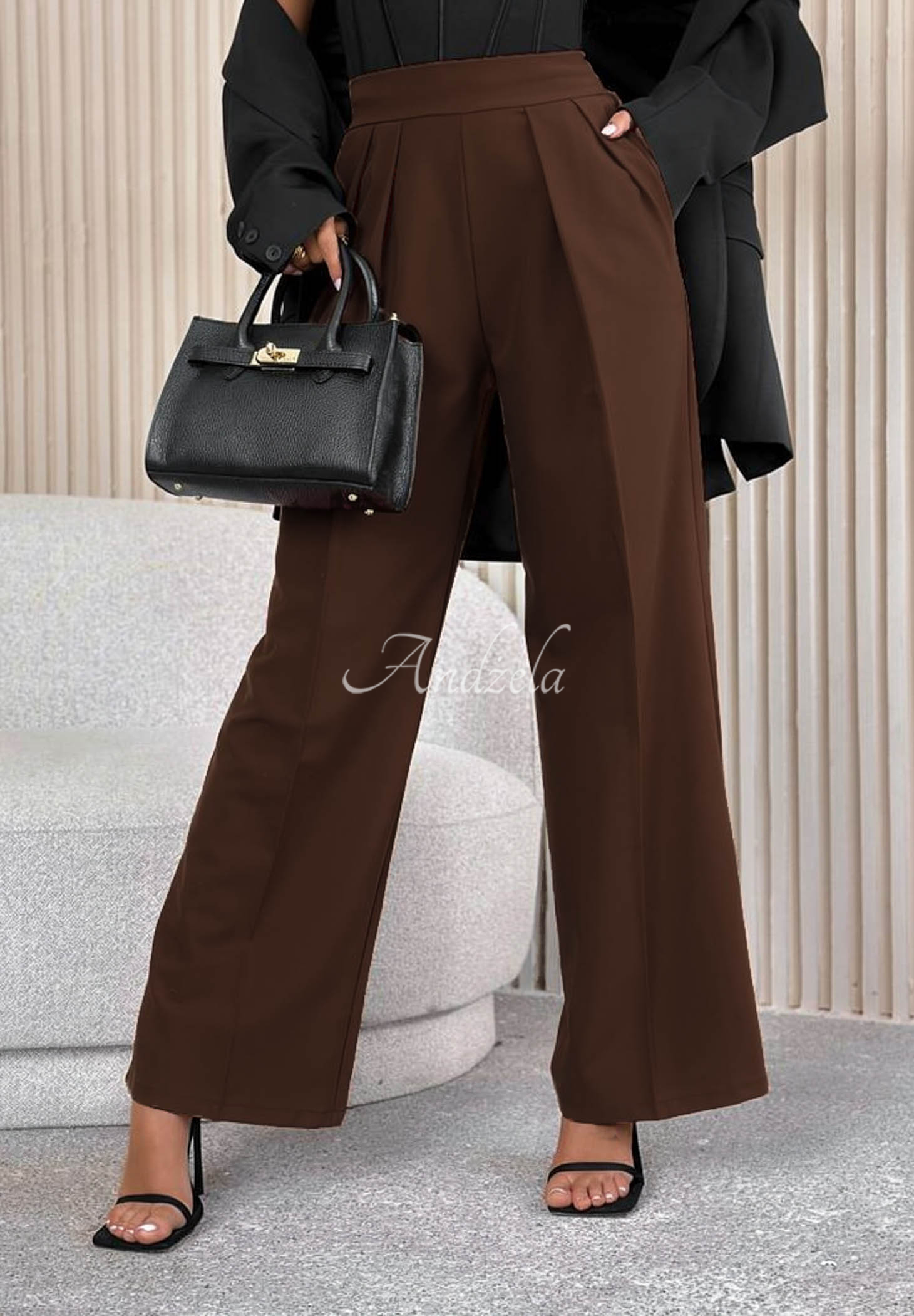 Elegantné nohavice vyrobené z nepružnej látky s prímesou viskózy. Tento model so širokými nohavicami má záhyby a elastický pás vzadu. Majú vysoký pás a funkčné vrecká vpredu.