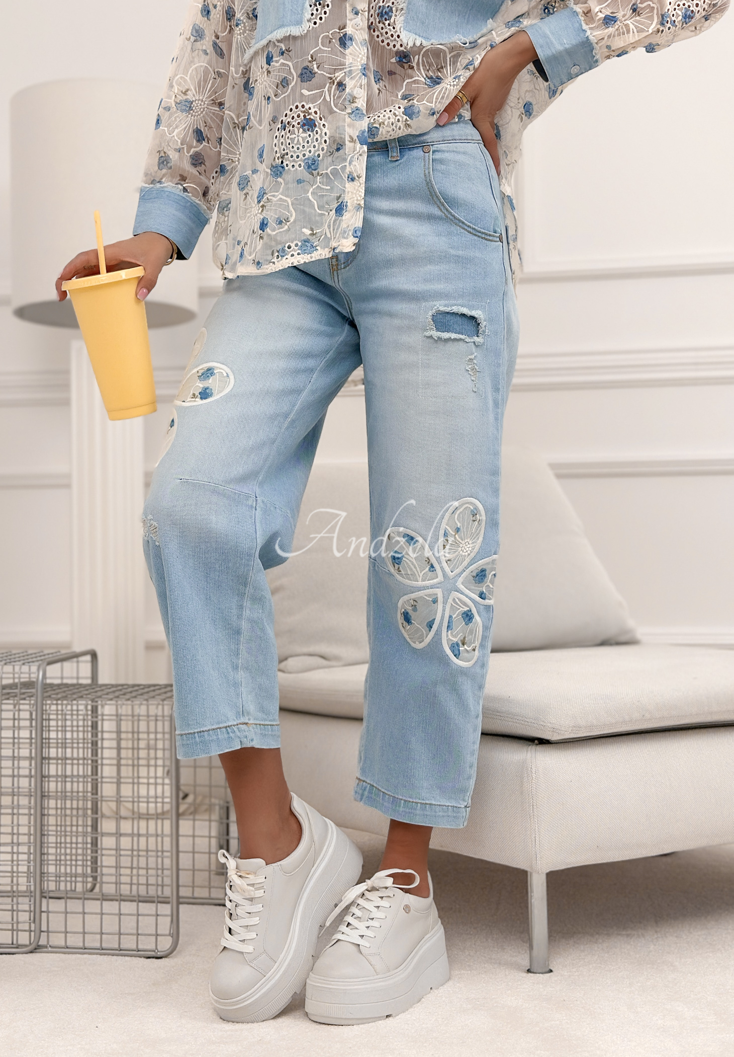 Džínsy strihu mom fit, ktoré sa vyznačujú ozdobnými vyšívanými kvetmi. Tieto džínsy s vysokým pásom a zúženými nohavicami majú zapínanie na zips a gombík. Majú funkčné vrecká vpredu aj vzadu a jemné odreniny.