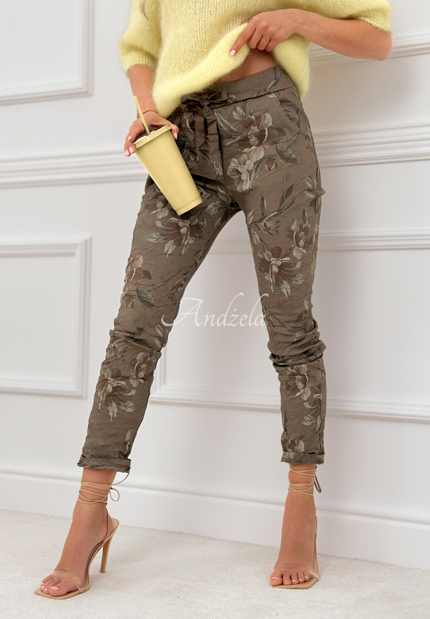 Pohodlné nohavice vyrobené z mierne elastickej viskózovej látky. Majú celoplošnú kvetinovú potlač. Majú klasický strih so stredne vysokým pásom a zúženými nohavicami. Pás má nastaviteľnú elastickú šnúrku a funkčné vrecká sa nachádzajú vpredu a vzadu.