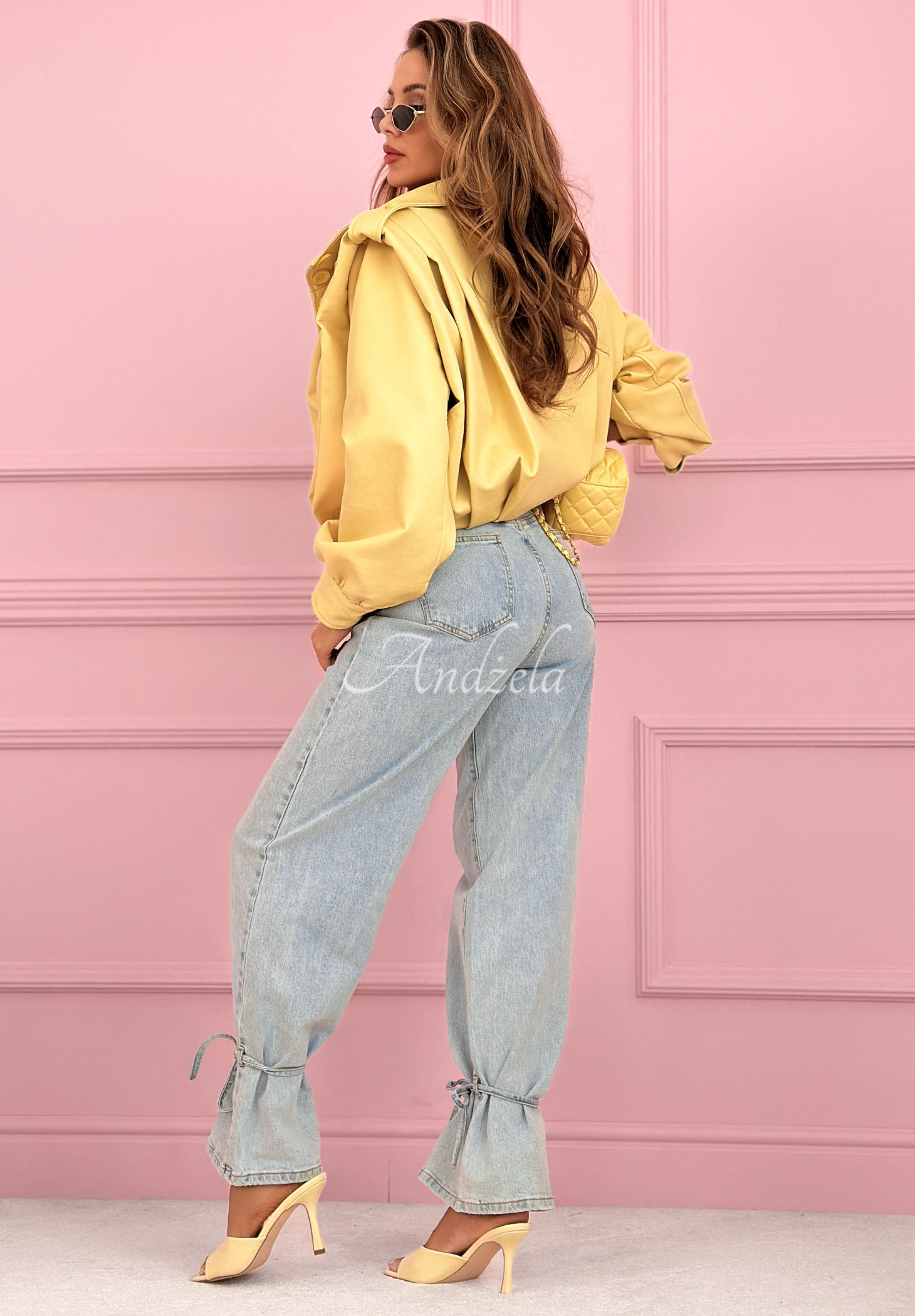 Džínsy wide leg s rovnými nohavicami. Tento model sa vyznačuje zaväzovaním na koncoch nohavíc a tenkým džínsovým opaskom. Majú vysoký pás a praktické vrecká vpredu a vzadu.