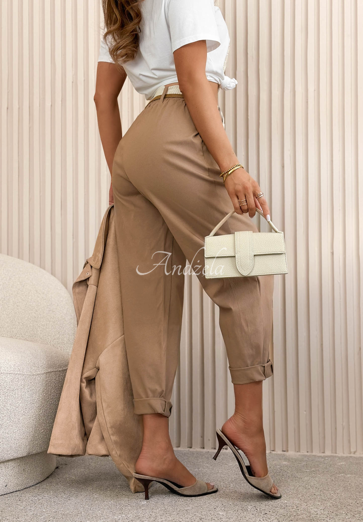 Nohavice sú vyrobené z elastickej viskózovej látky. Majú strih „mom fit“ s funkčnými prednými vreckami. V páse je elastická guma a pútka na opasok. Opasok je súčasťou .