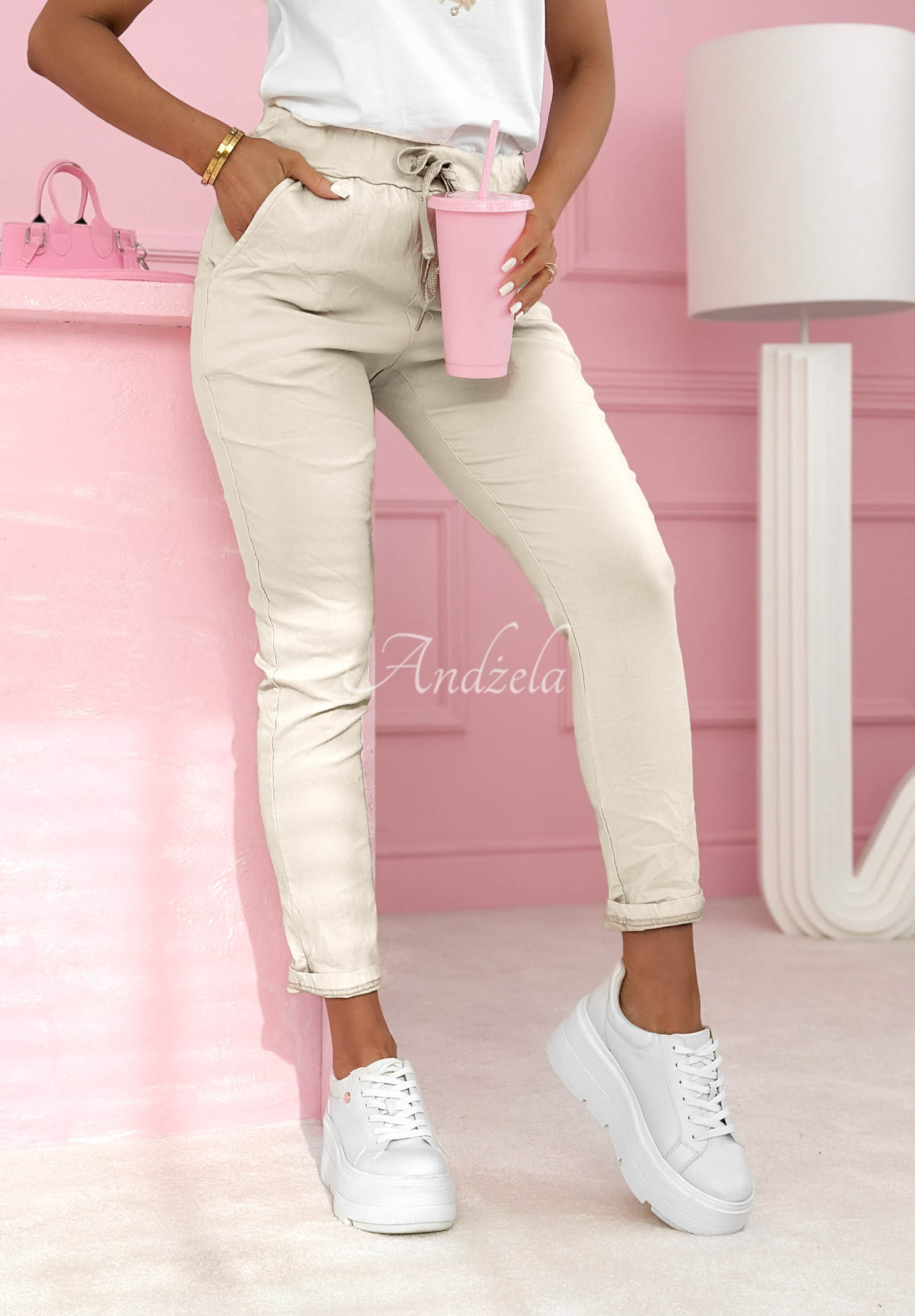 Nohavice majú krčený efekt a sú vyrobené z elastickej viskózovej tkaniny. Majú vysoký pás a elastický pás so sťahovacou šnúrkou, ako aj praktické vrecká vpredu.