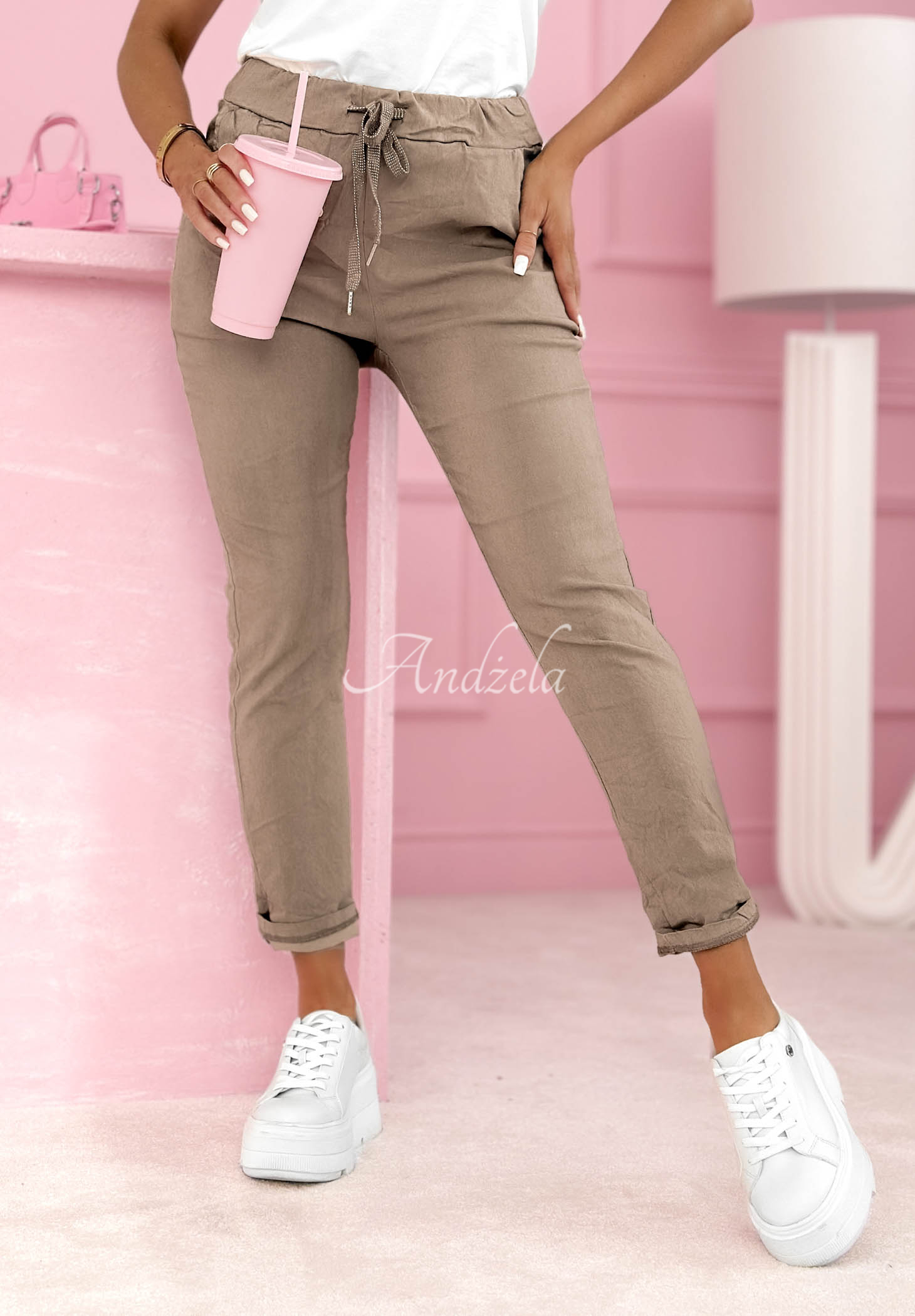 Nohavice majú krčený efekt a sú vyrobené z elastickej viskózovej tkaniny. Majú vysoký pás a elastický pás so sťahovacou šnúrkou, ako aj praktické vrecká vpredu.