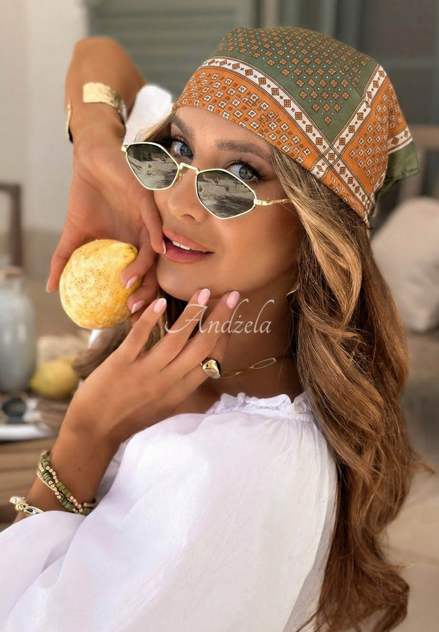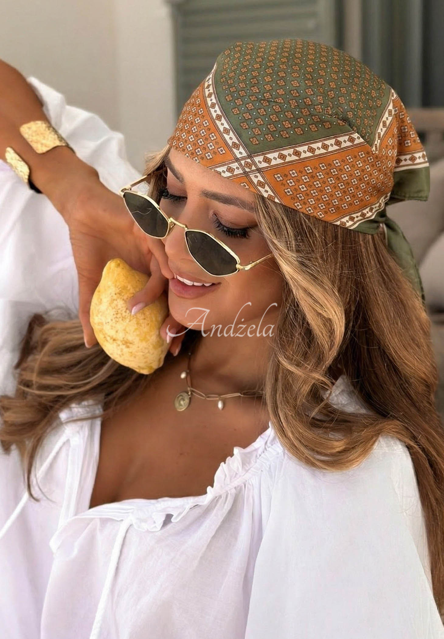 Šatka vyrobená z ľahkej látky, vyznačujúca sa ozdobnými vzormi.* neelastický materiál* vzory