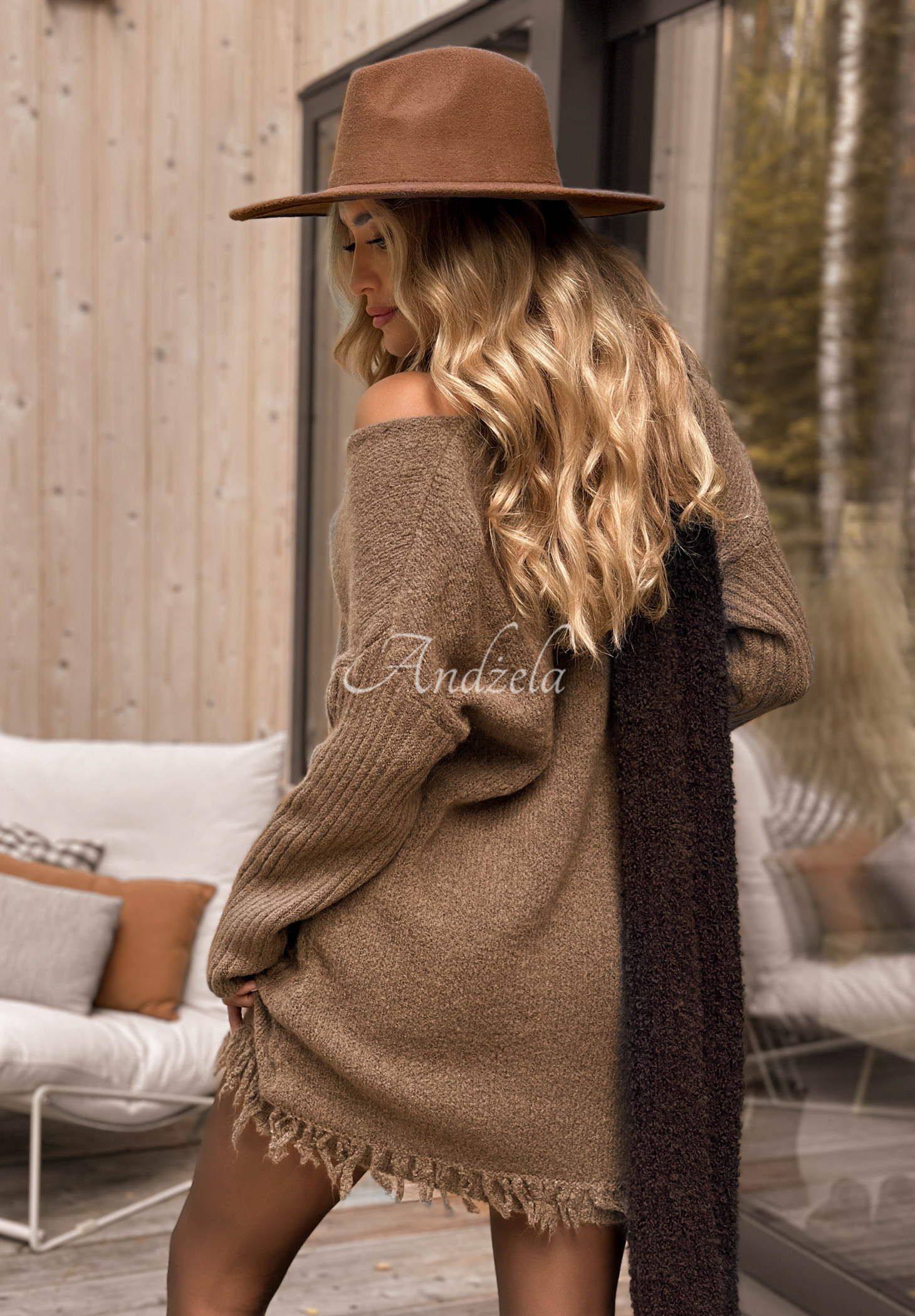 Svetrové šaty sú vyrobené z mäkkej látky so zmesou vlny a alpaky. Majú predné vrecká a ozdobné strapce. Sú to mini šaty s ženským výstrihom do V a dlhými rebrovanými manžetami.