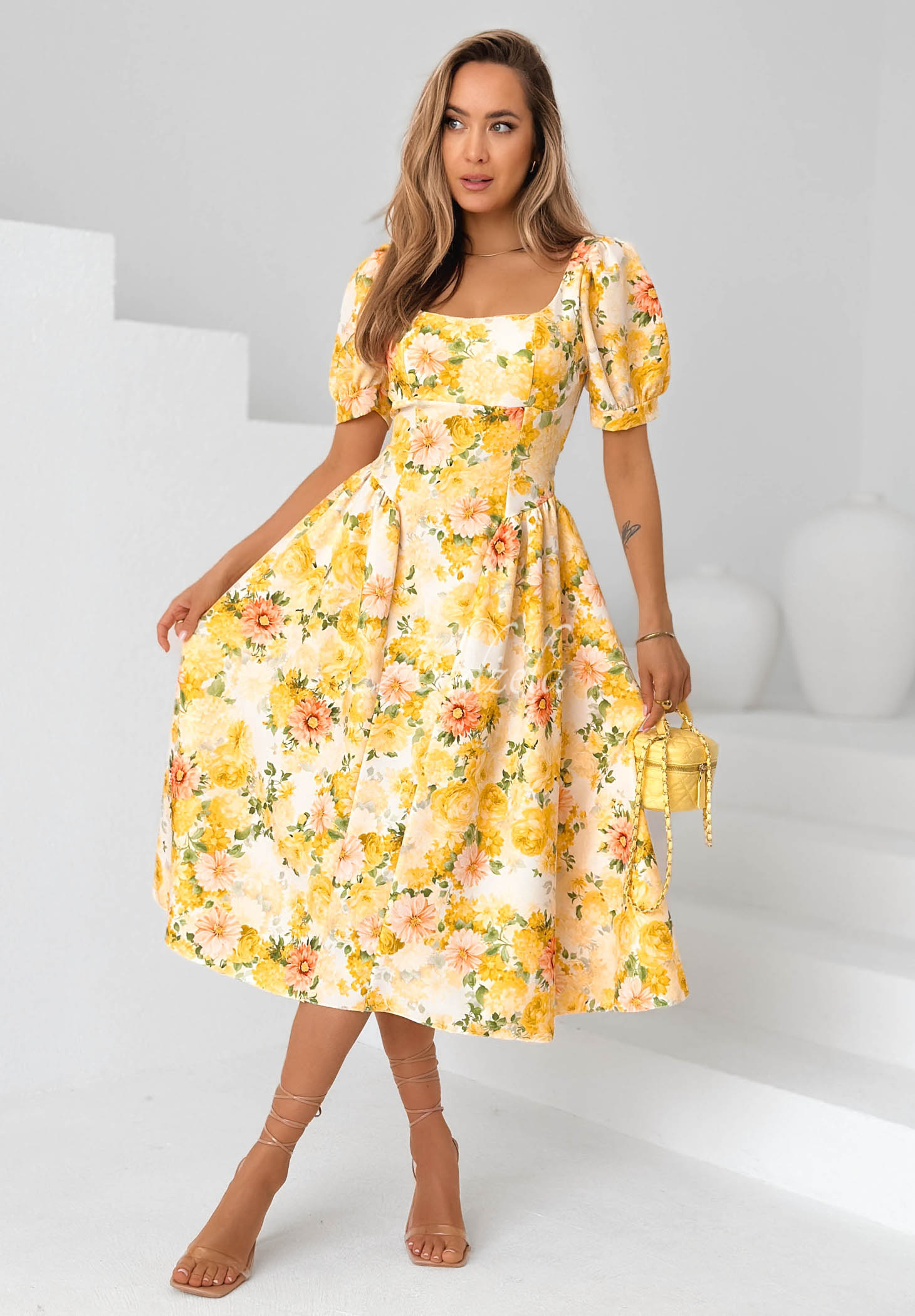 Tieto kvetinové šaty s naberanými rukávmi majú priliehavý vrch a rozšírenú sukňu. Majú štvorcový výstrih, vystužené košíčky a všitý opasok. Zapínajú sa na zips vzadu.