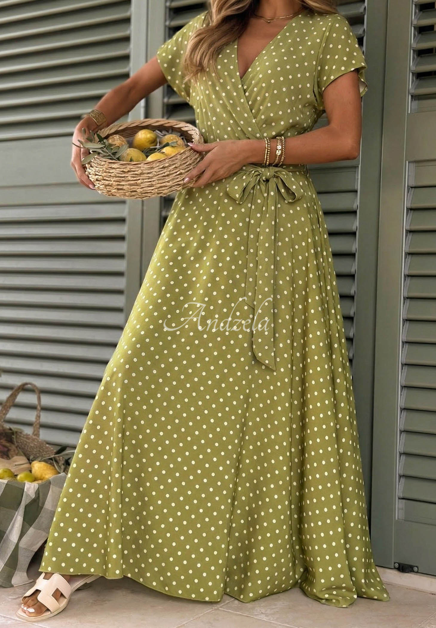 Šaty s módnou potlačou, vyrobené z ľahkej, na dotyk príjemnej látky. Ide o návrh s obálkovým výstrihom a ženským rozparkom v spodnej časti. V páse majú gumičku, súčasťou súpravy je aj látkový opasok.