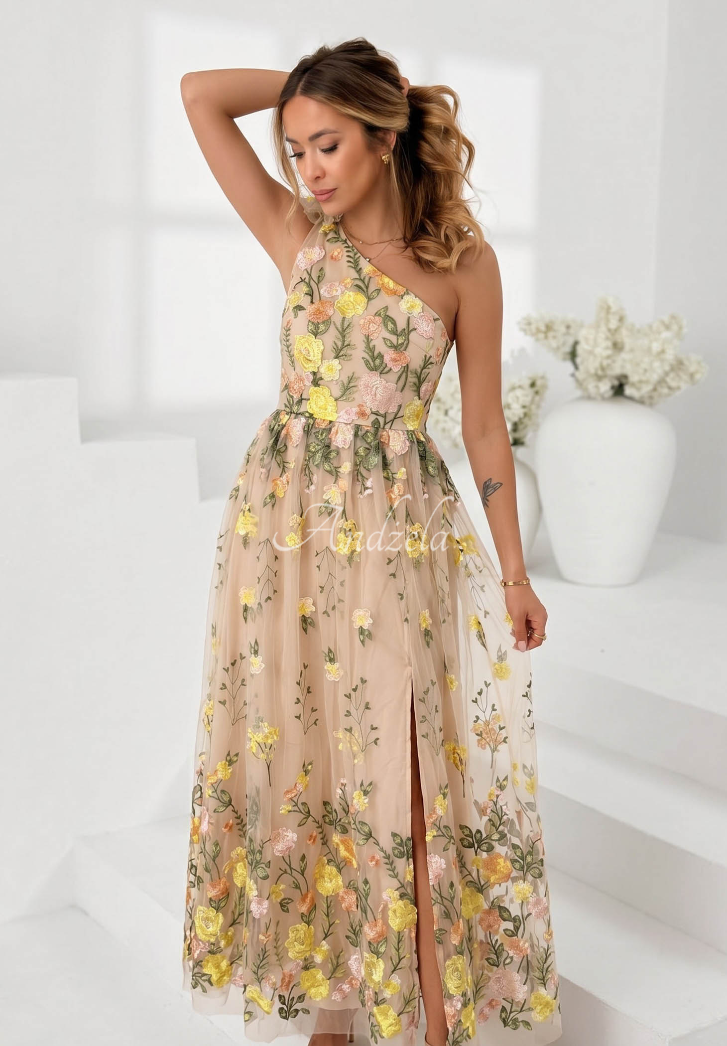 Tylové šaty sú zdobené celoplošne vyšívanými kvetmi. Tieto šaty v maxi dĺžke majú bočné zapínanie na zips. Sú podšité a súčasťou je brošňa.