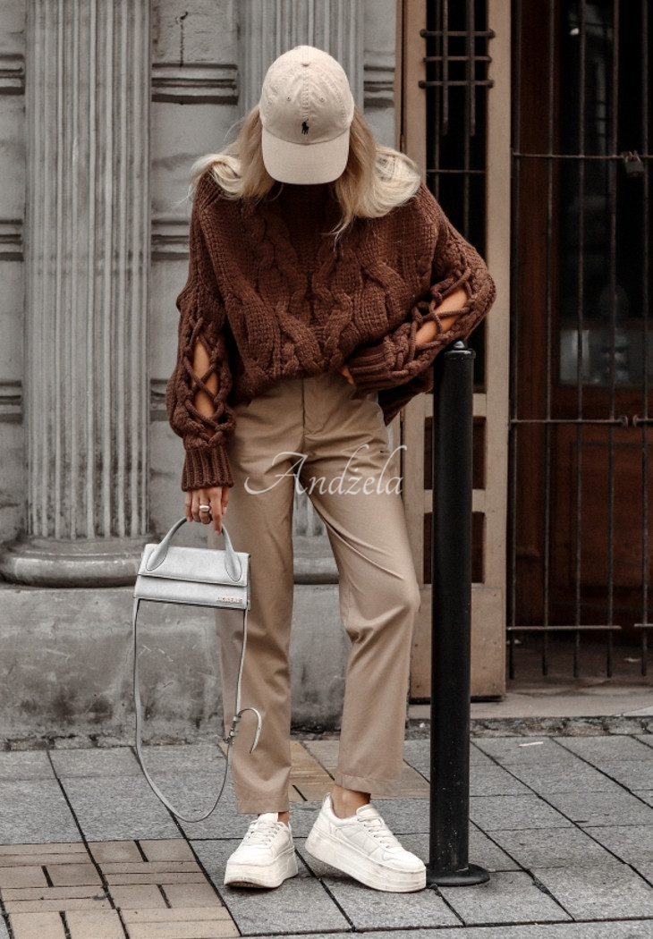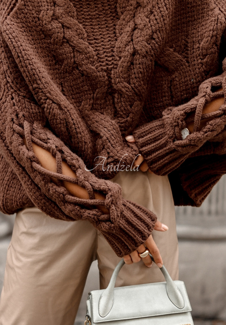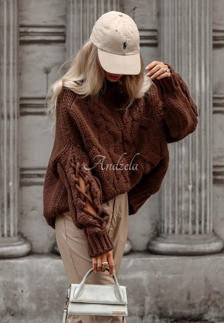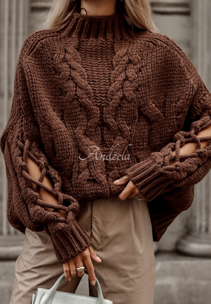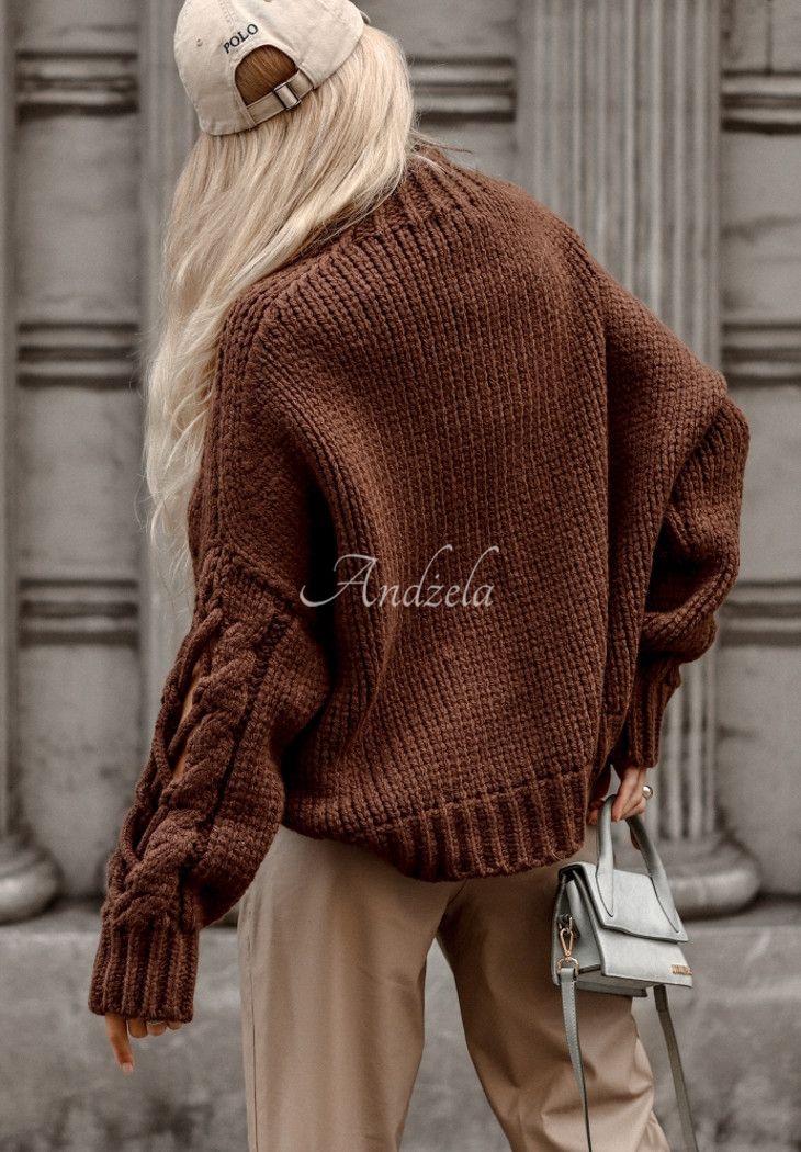 Krásny sveter s ozdobnou väzbou je perfektnou voľbou pre jesenné a zimné štylizácie. Vyznačuje sa originálnymi rukávmi, ktoré mu dodávajú charakter. Oversize model má stojačik. Krásne sa bude prezentovať v elegantných aj športových štylizáciách. Produkt je dostupný v niekoľkých farebných variantoch.