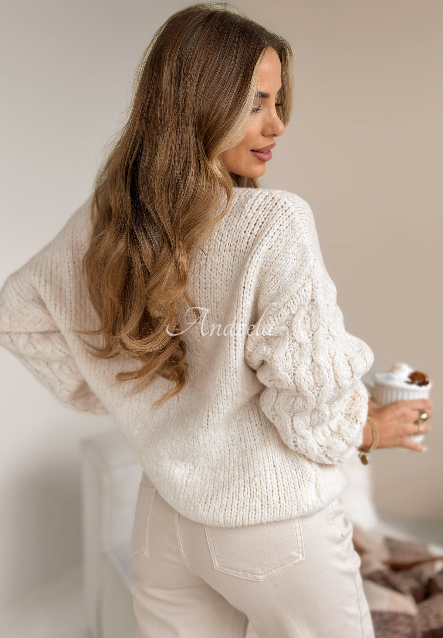 Sveter s pletenými rukávmi s vlnou Braided Twirls béžový