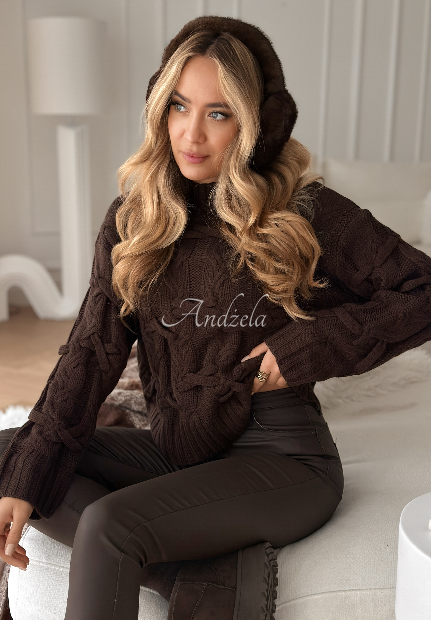 Sveter, ktorý sa vyznačuje ozdobnou, hustou väzbou. Tento model má stojatý golier a dlhé rukávy, ktoré sú rovnako ako lem zakončené rebrovanými manžetami.