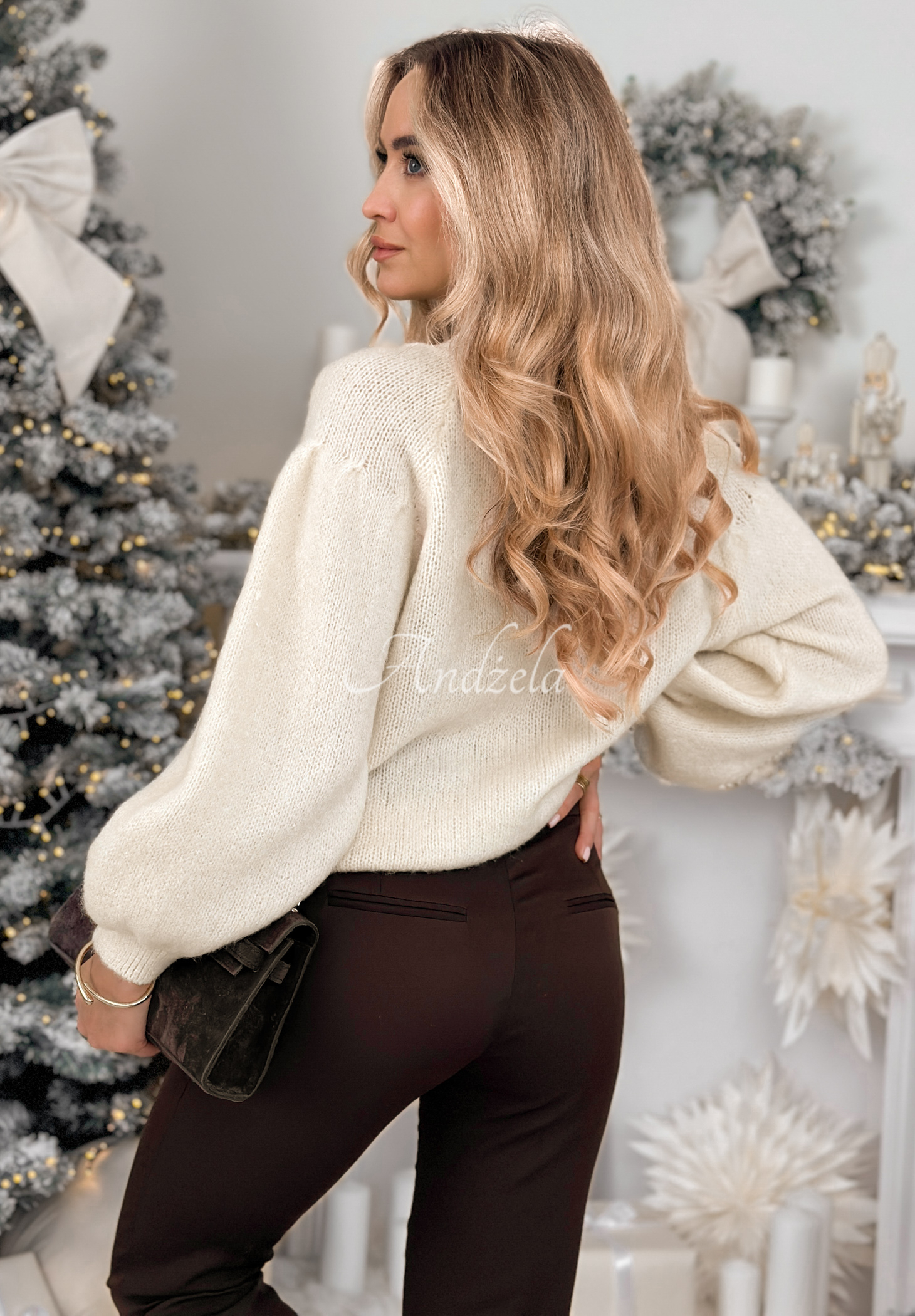 Mäkký sveter je vyrobený z elastickej látky so zmesou vlny, alpaky a viskózy. Má ozdobný kvet a volán. Má zaoblený výstrih a rebrované manžety a lem.* elastická látka* zaoblený výstrih* kvet s volánom* rebrované manžety a lem