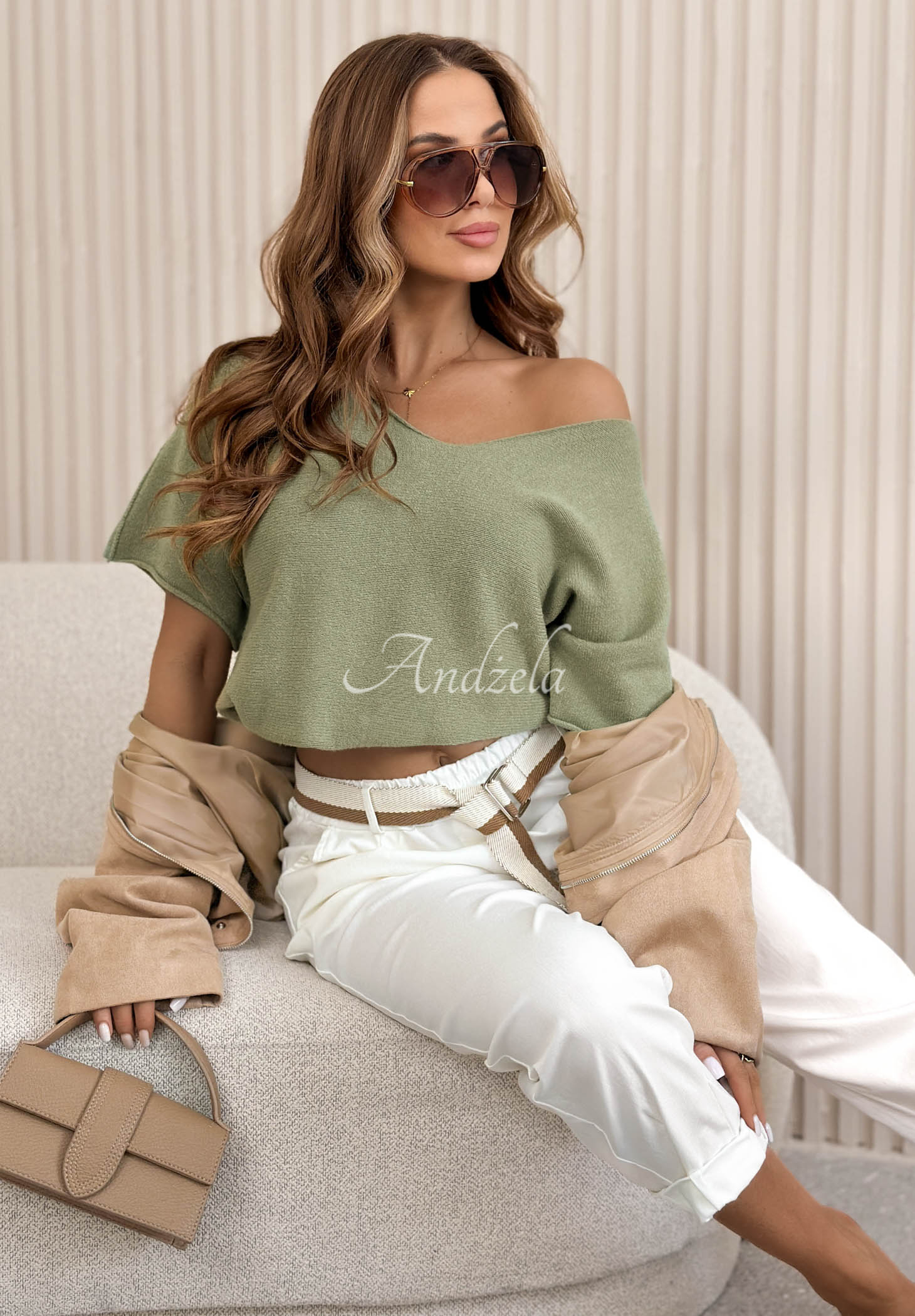 Viskózový sveter s výstrihom Summer Daydream khaki
