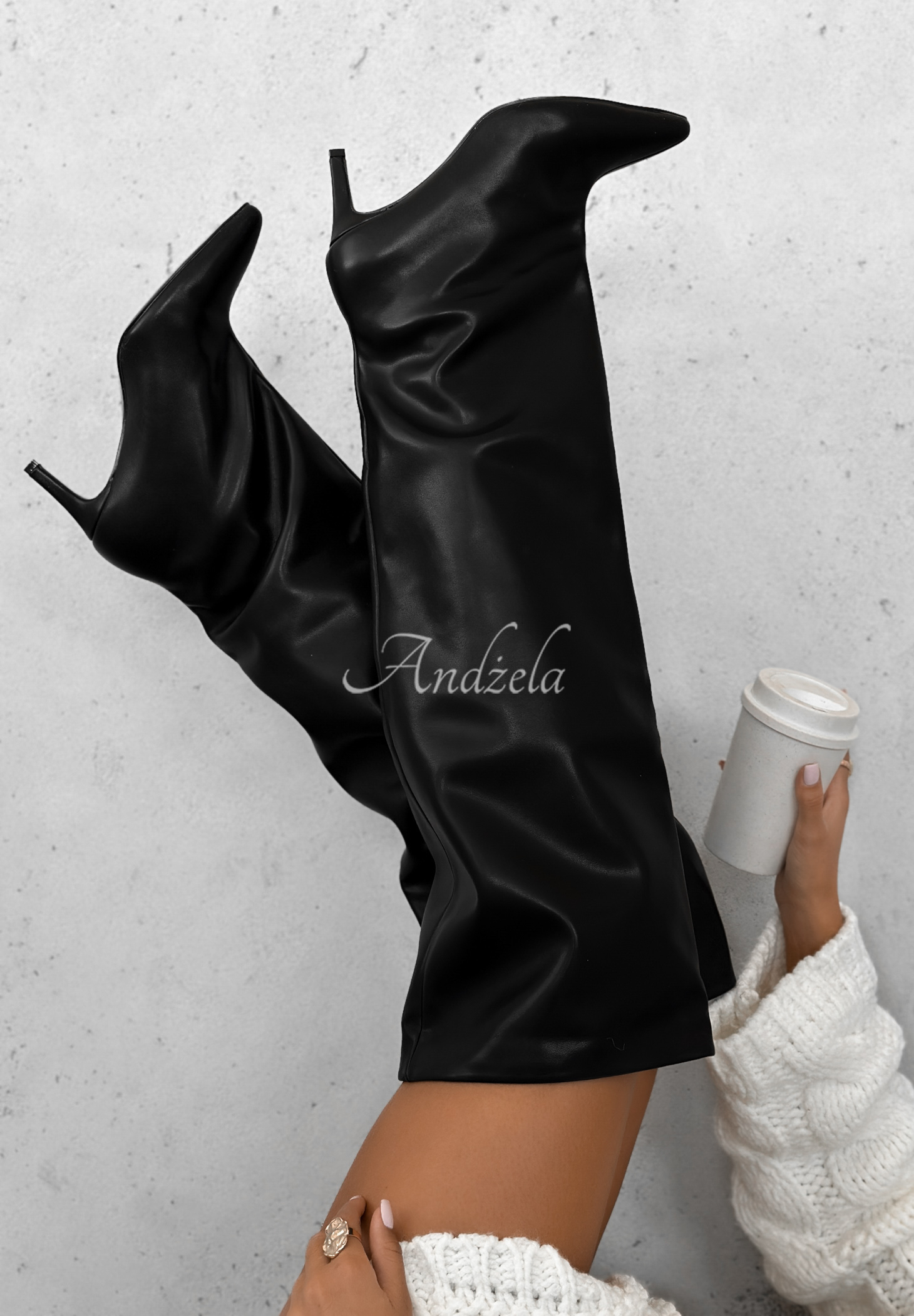 Čižmy nad kolená z mäkkého koženého materiálu. Tento model má špicatú špičku a úzky ihličkový podpätok.* imitácia kože* bez zateplenia* špicatá špička* zvršok nad kolená* bez zapínania* ihličkový podpätok