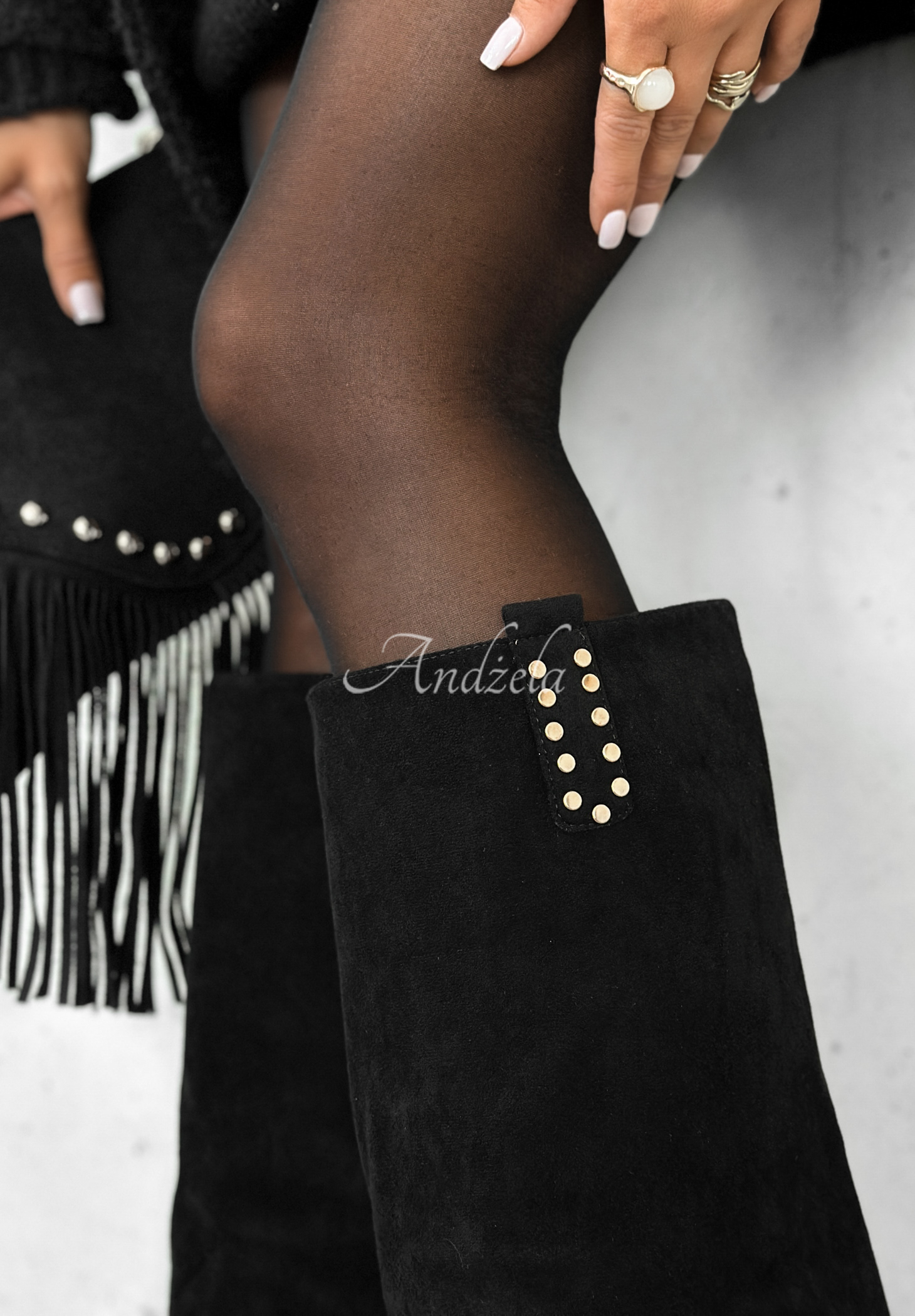 Dlhé čižmy z imitácie semišu s vysokým podpätkom. Model sa zapína na vnútorný zips a má na vonkajšej strane dodatočný materiál. Tento model zdobia ozdobné zlaté detaily.