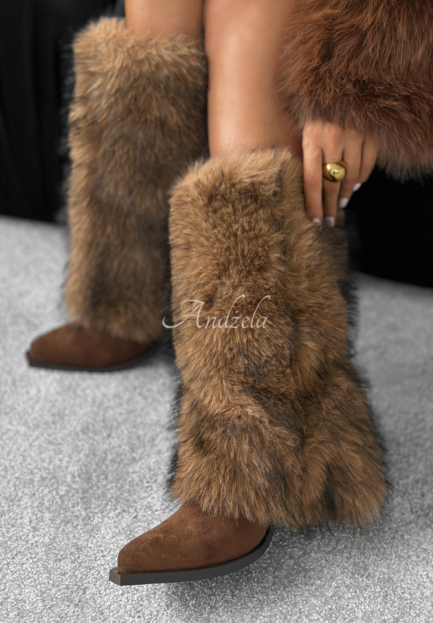 Semišové členkové čižmy so zvýšeným podpätkom. Tento model má špicatú špičku a mäkkú podšívku z umelej kožušiny. Zapínanie na bočný zips.