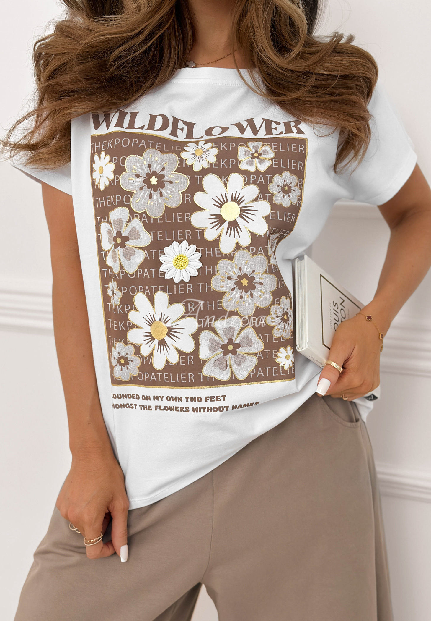 Mäkké tričko je vyrobené z vysoko kvalitnej bavlny. Má potlač na prednej strane, ktorá je ďalej zdobená zlátením a kvetinovou nášivkou. Je to elastické tričko klasického strihu s krátkymi rukávmi, okrúhlym výstrihom a mierne predĺženým chrbtom.