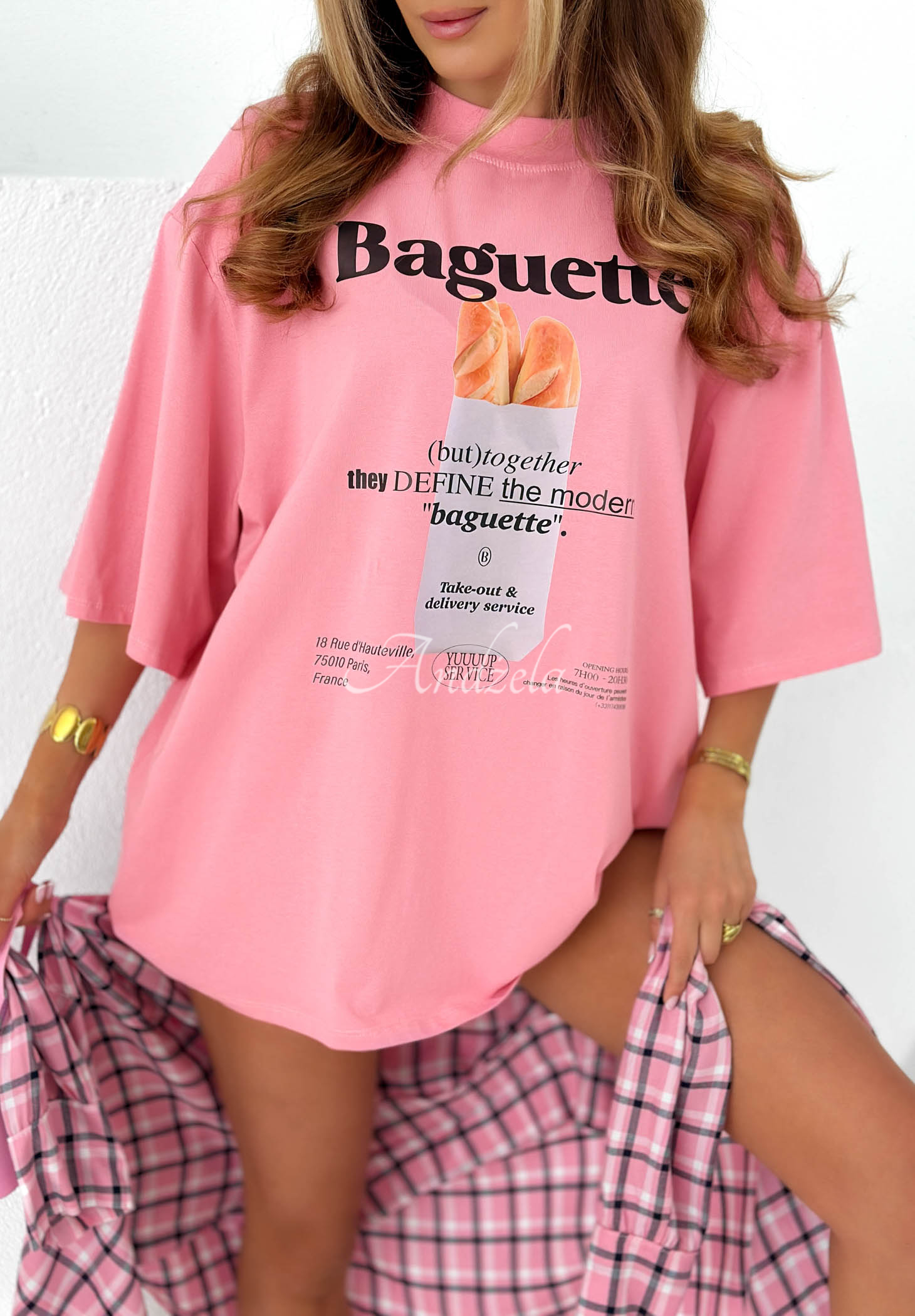 Tričko má módnu potlač a tvarujúce ramenné vypchávky. Je vyrobené z bavlnenej látky, má mierne oversize strih so zaobleným výstrihom a krátkymi rukávmi.