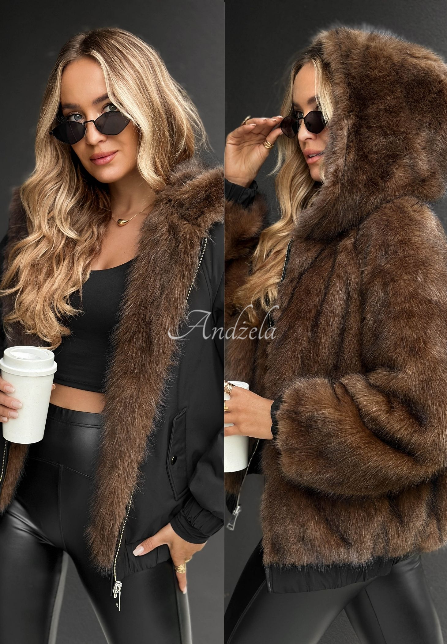 Táto bunda je synteticky zateplená a obojstranná, čo umožňuje rôzne možnosti štýlu. Je hladká, vyrobená z látky na jednej strane a lemovaná neuveriteľne mäkkou umelou kožušinou na druhej strane. Tento model má kapucňu a strieborný zips. Má funkčné vrecká vpredu a elastický pás v spodnej časti.
