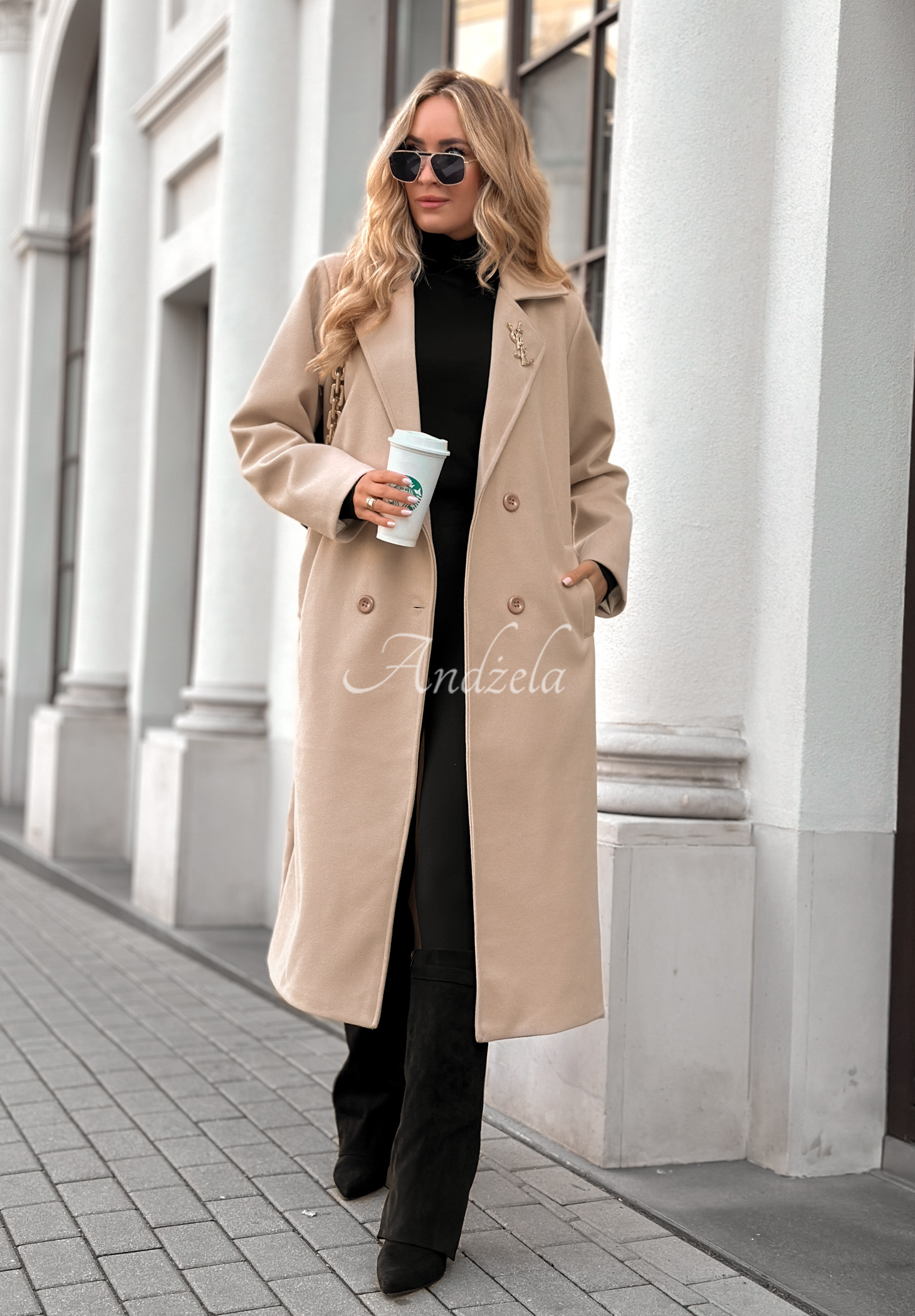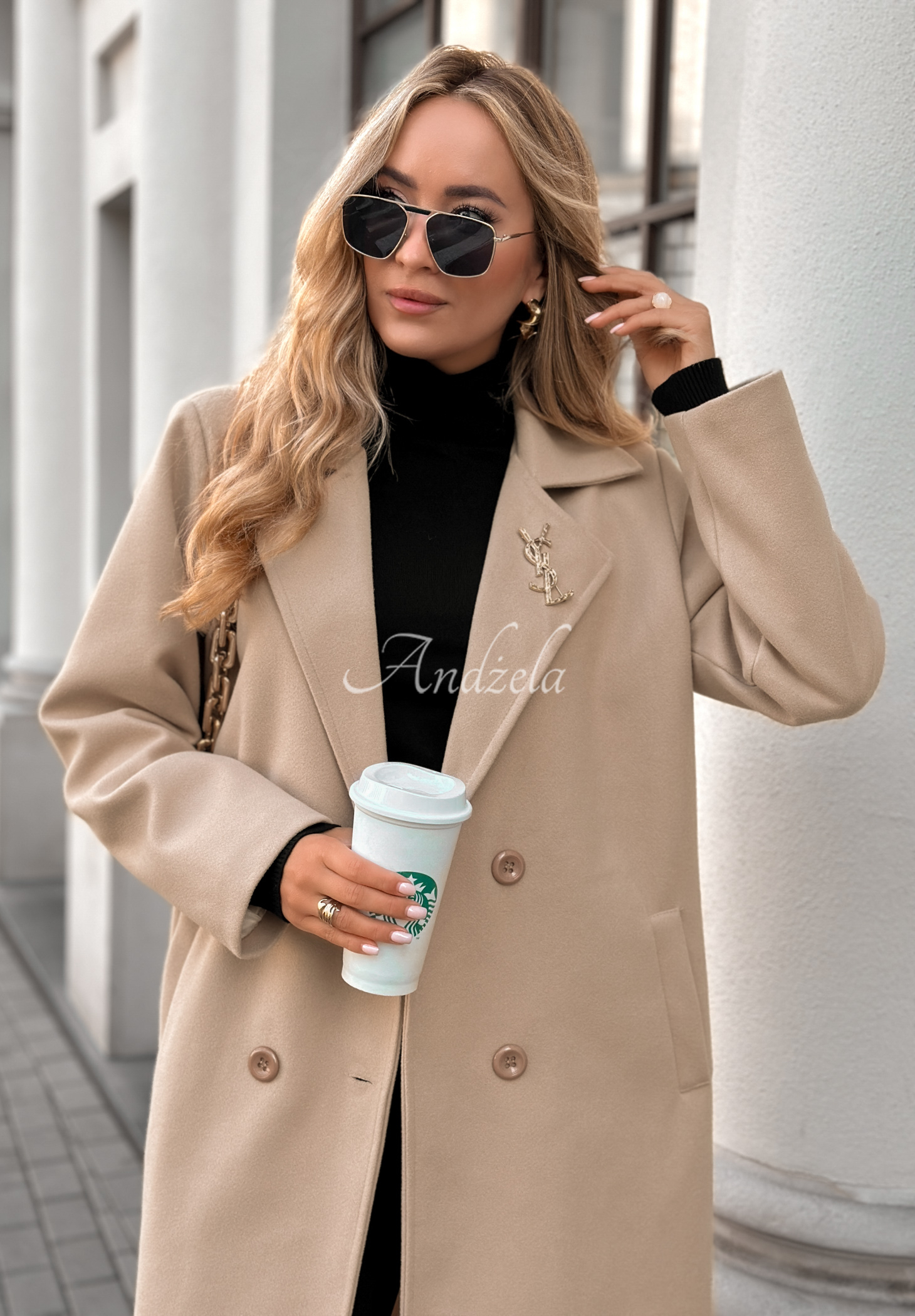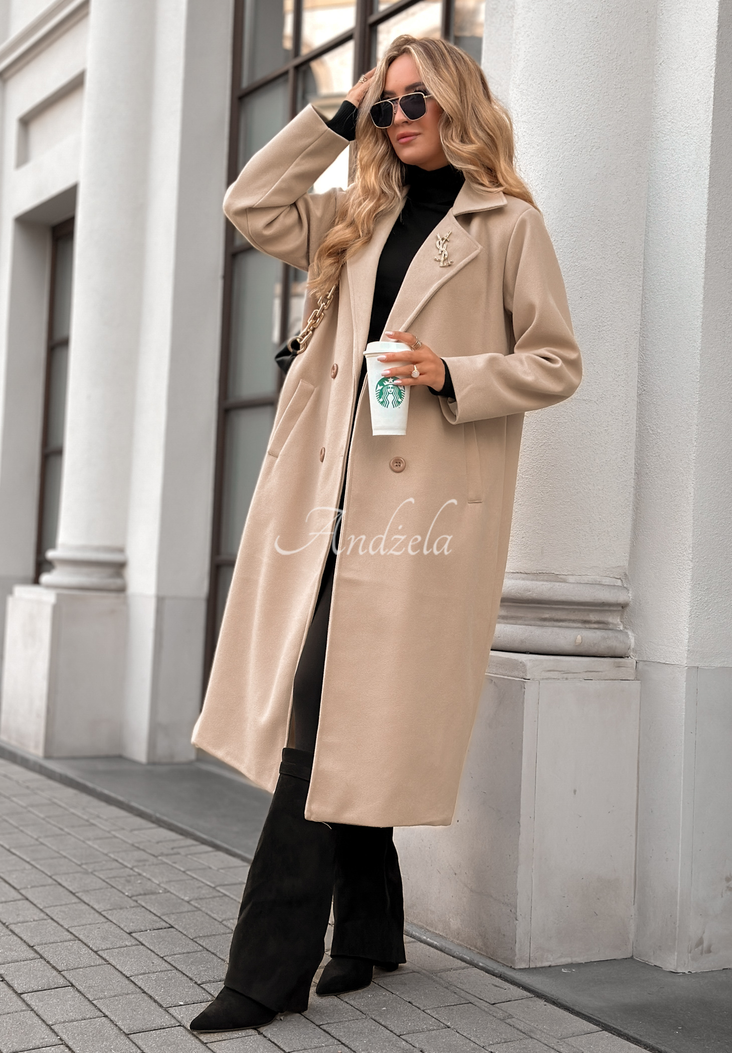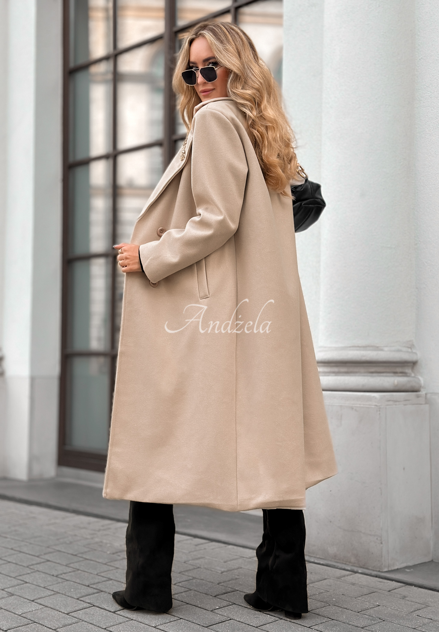 Dvojradový kabát oversize strihu zapínaný na gombíky. Model má golier a vrecká na úrovni pása.
